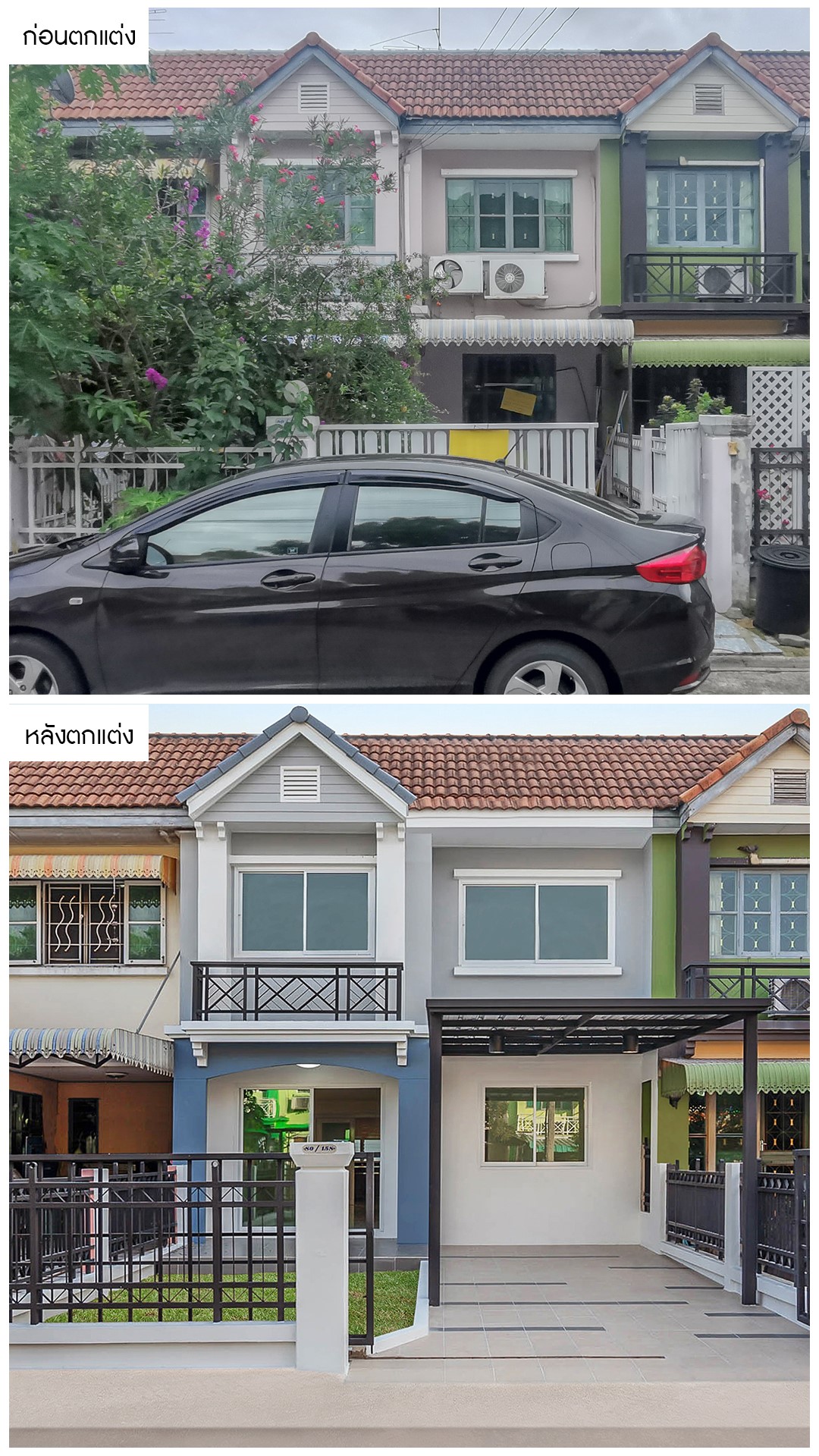 จากหน้าบ้านที่ดูมีสภาพเก่า สีซีดจาง และดูรถทึบ เราได้ทำการทาสีใหม่ทั้งหลังเพื่อเพิ่มความโดดเด่น และเคลียร์พื้นที่หน้าบ้านให้โปร่งโล่งคืนชีวิตชีวาให้กับตัวบ้าน ทำให้น่าอยู่มากขึ้นครับ