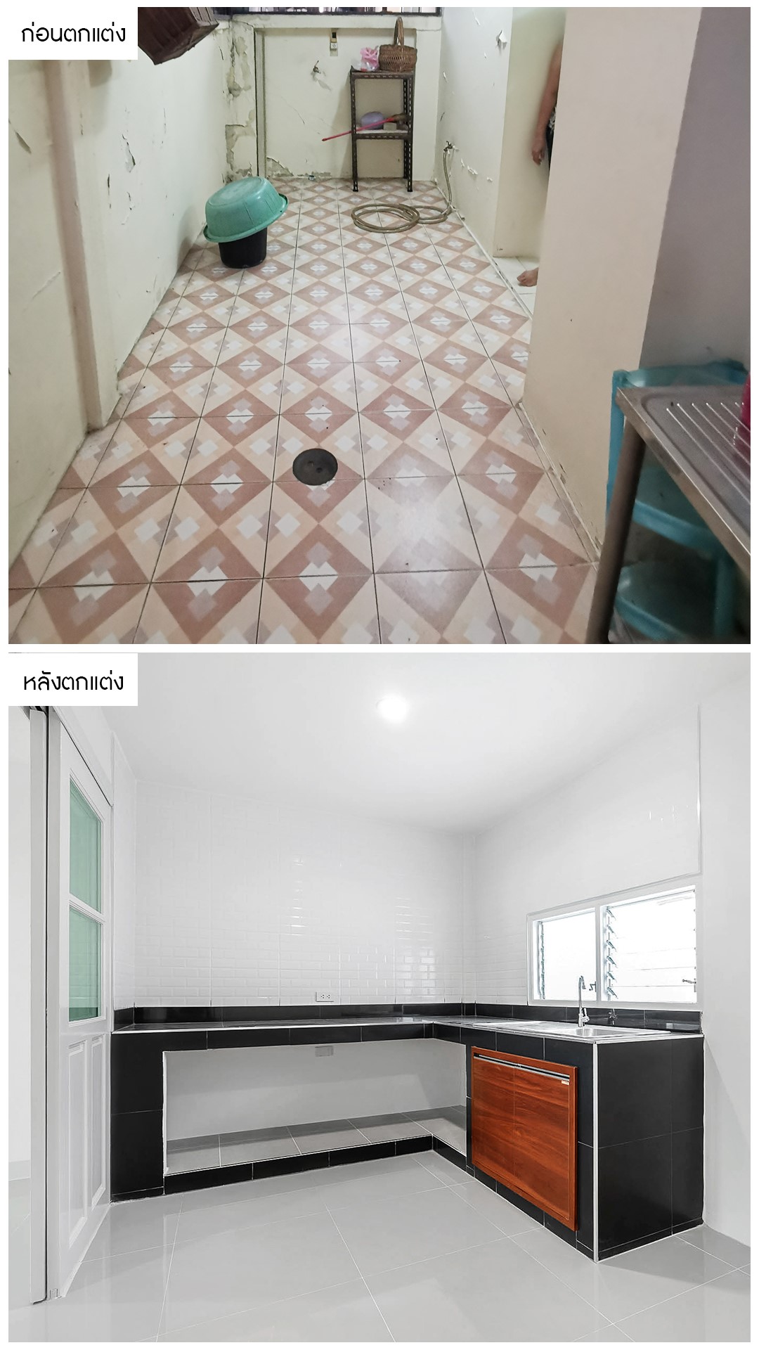 จากเดิมครัวที่มีสภาพเก่า ไม่พร้อมใช้งาน เราได้ทำการปรับปรุง/ต่อเติมให้ครบครันทุกฟังก์ชั่นทั้งครัวเคาน์เตอร์ ซิงค์ล้างจาน แแผงกันกระเด็น