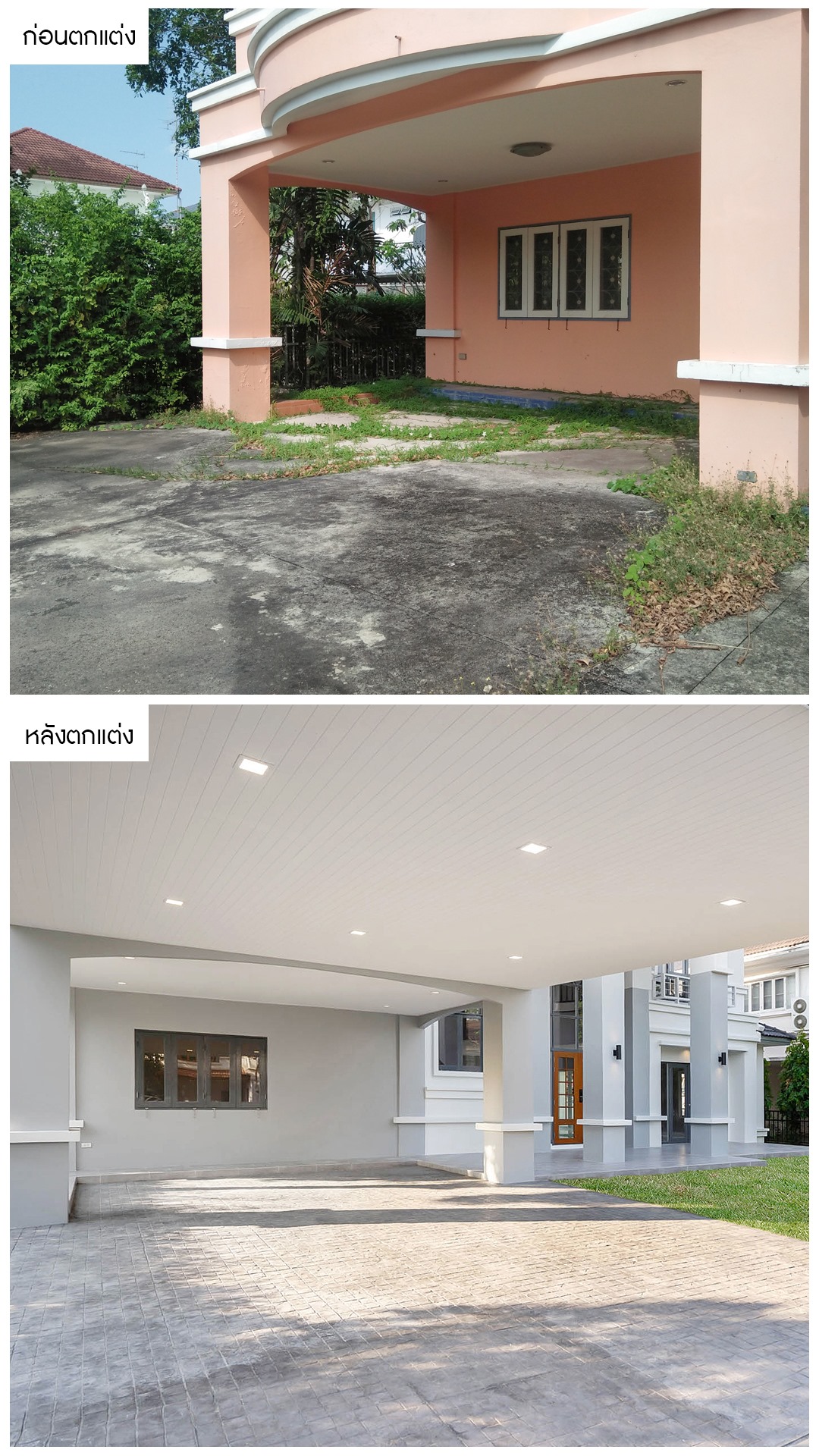 เราได้ต่อเติมหลังคาโรงจอดรถเพิ่มดีไซน์สวยด้วยไม้ระแนง และติดไฟดาวน์ไลท์เพิ่มความเรียบหรู จากเดิมที่เคยเป็นพื้นปูน เราได้ทำการตกแต่งพื้นด้วยคอนกรีตแสตมป์ ที่ใช้กับบ้านมือหนึ่งราคาระดับ 10 ล้านขึ้นไป (...แต่บ้านหลังนี้รวมตกแต่งแล้วขายในราคาไม่ถึง 10 ล้าน)