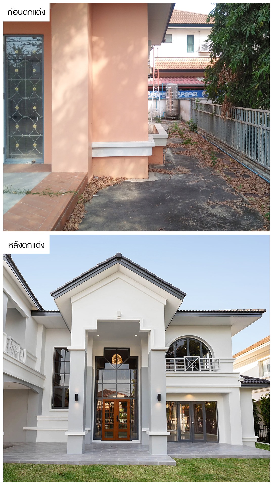 ส่วนของบริเวณรอบตัวบ้านจากเดิมที่ได้เทปูนไว้ทั้งหมด เราได้ปรับให้มีพื้นที่สีเขียวมากขึ้นโดยปูสนามหญ้าในพื้นที่โดยรอบเพื่อรองรับกิจกรรมต่างๆ ของสมาชิกในครอบครัว