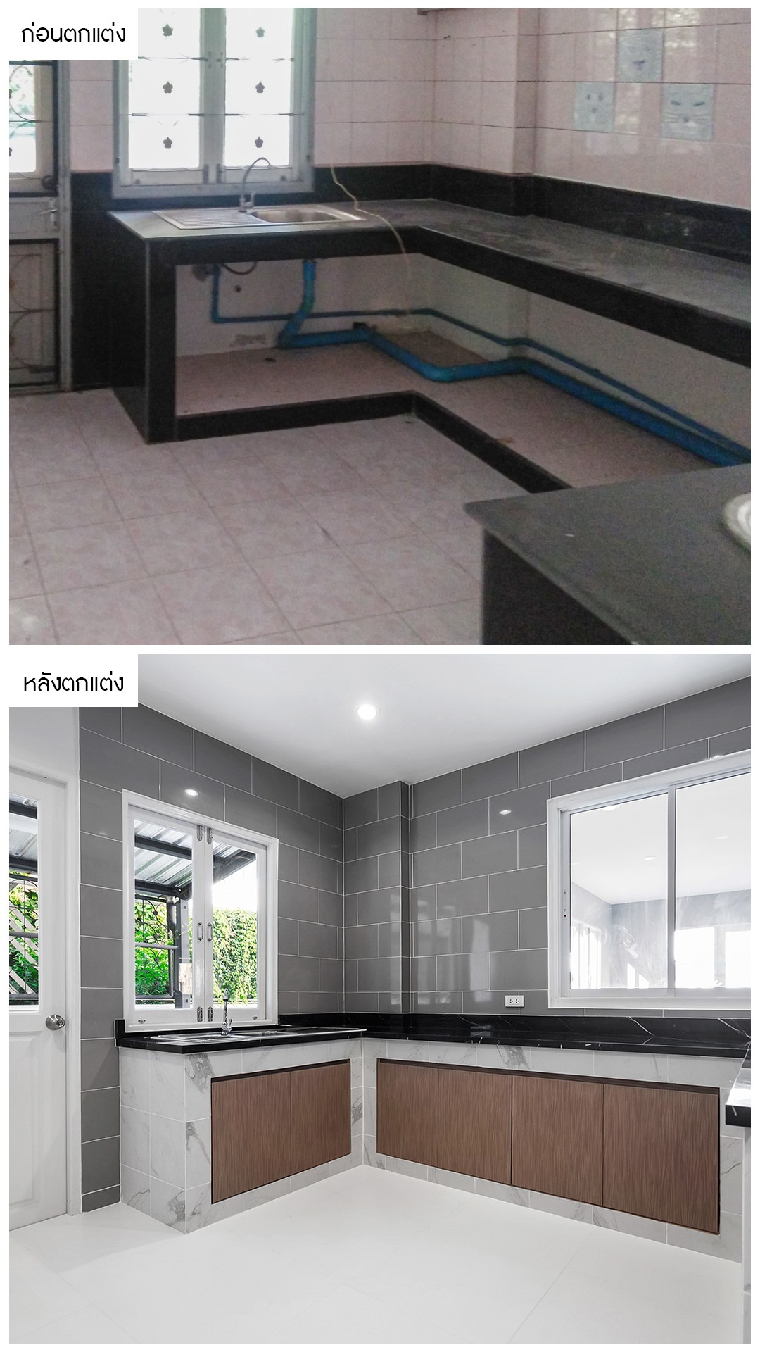 ห้องครัวจากเดิมที่มีสภาพเก่า ไม่ทันสมัย เราได้ดีไซน์ใหม่ให้เป็นครัวสไตล์โมเดิร์น ที่ดูทันสมัยแต่มีความเรียบหรูเหมาะกับตัวบ้าน พร้อมวัสดุตกแต่งเกรดพรีเมี่ยมที่สวยงาม ทนทาน และง่ายต่อการทำความสะอาด