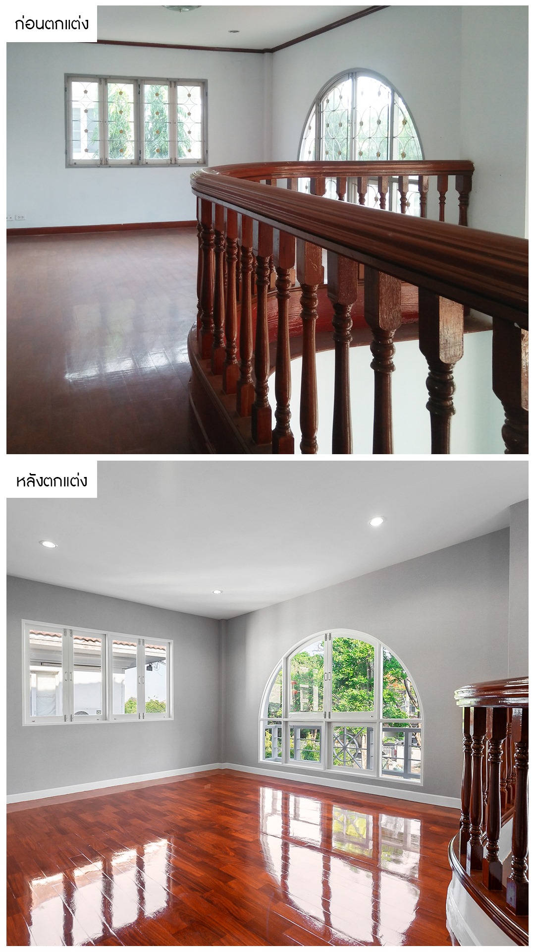 โถงบันได ได้เปลี่ยนพื้นเป็นปาเก้ขัดเงา มีหน้าต่างอยู่โดยรอบให้ความรู้สึกโปร่งโล่ง เหมาะกับการตกแต่งเป็นห้องทำงาน หรือเป็นโซนเก็บของสะสมก็ดูดีนะครับ เป็นมุมหนึ่งที่เป็นเอกลักษณ์ของตัวบ้าน เพิ่มความโอ่โถงของคฤหาสน์หลังนี้ได้อย่างลงตัว ถ้าได้เดินมาหยุดดูวิว และมองออกไปนอกตัวบ้านจะได้ความรู้สึกแบบพจมานในบ้านทรายทองเลยครับ