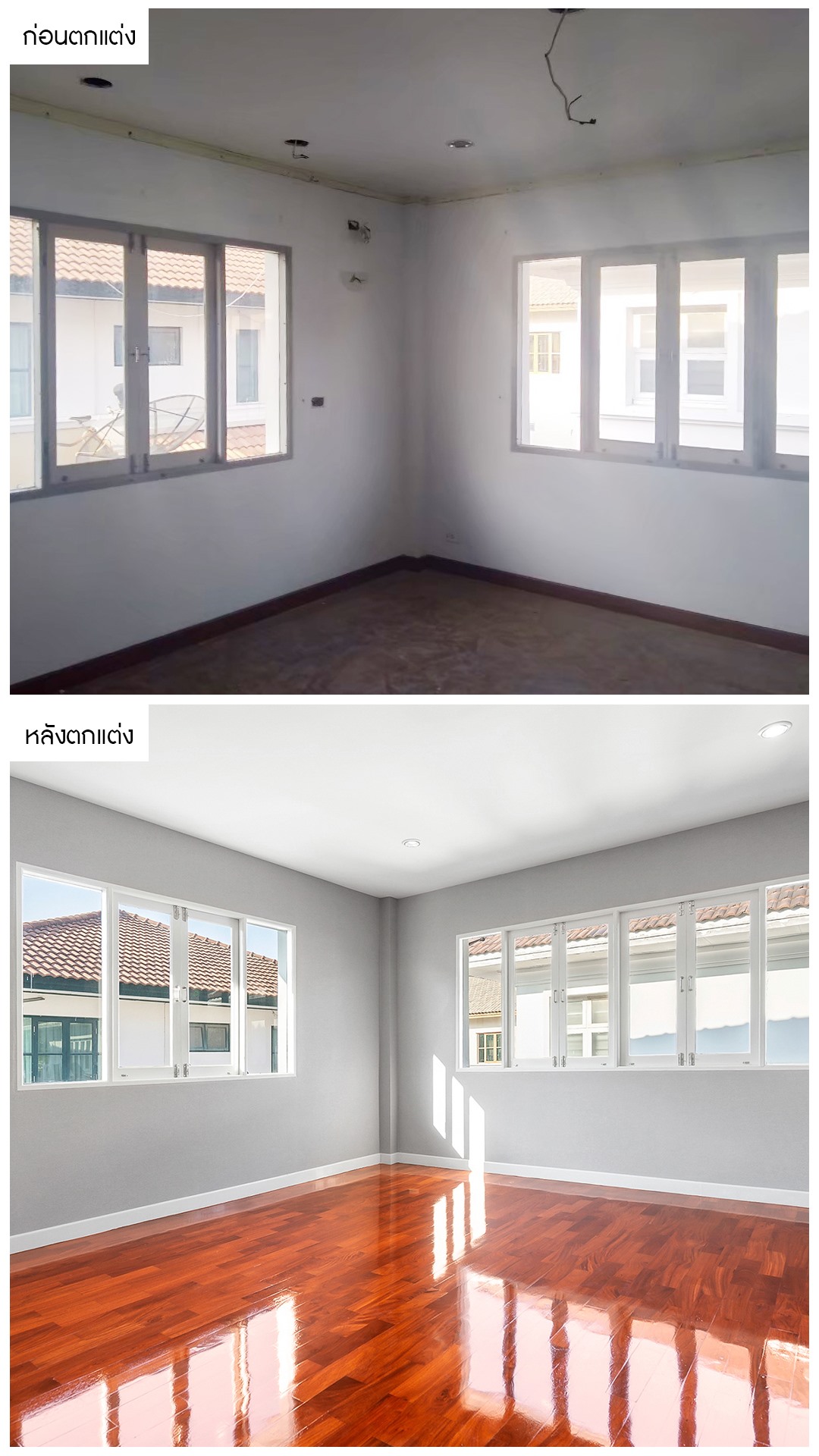 จากเดิมห้องนอนสภาพไม่พร้อมอยู่ ดูไม่ทันสมัย เราได้ทำการปรับปรุงปูพื้นเป็นปาเก้ พร้อมทั้งทาสีโทนอบอุ่น ตัดกับขอบบัวสีขาวให้ความรู้สึกผ่อนคลายเหมาะกับการพักผ่อน