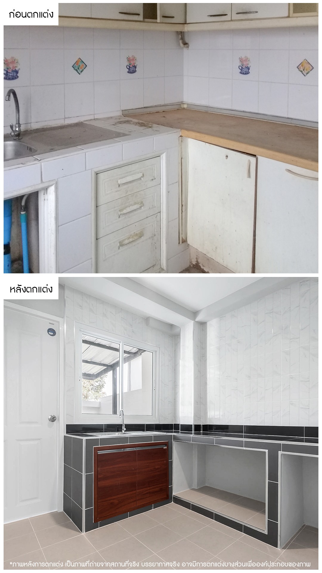 จากเดิมที่เคยเก่าทรุดโทรม เราได้ปรับปรุงให้มีพื้นที่ใช้งานมากขึ้น ติดหน้าบานเคาน์เตอร์เพิ่มความสวยงาม และปูกระเบื้องจรดผนังที่ทำความสะอาดง่าย