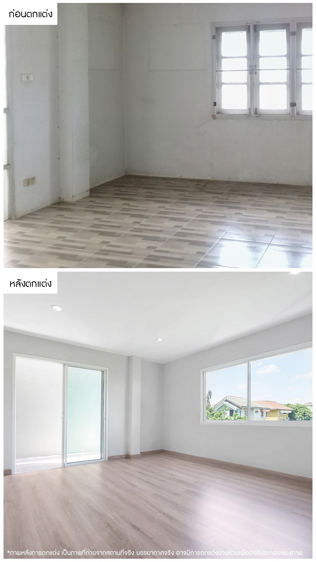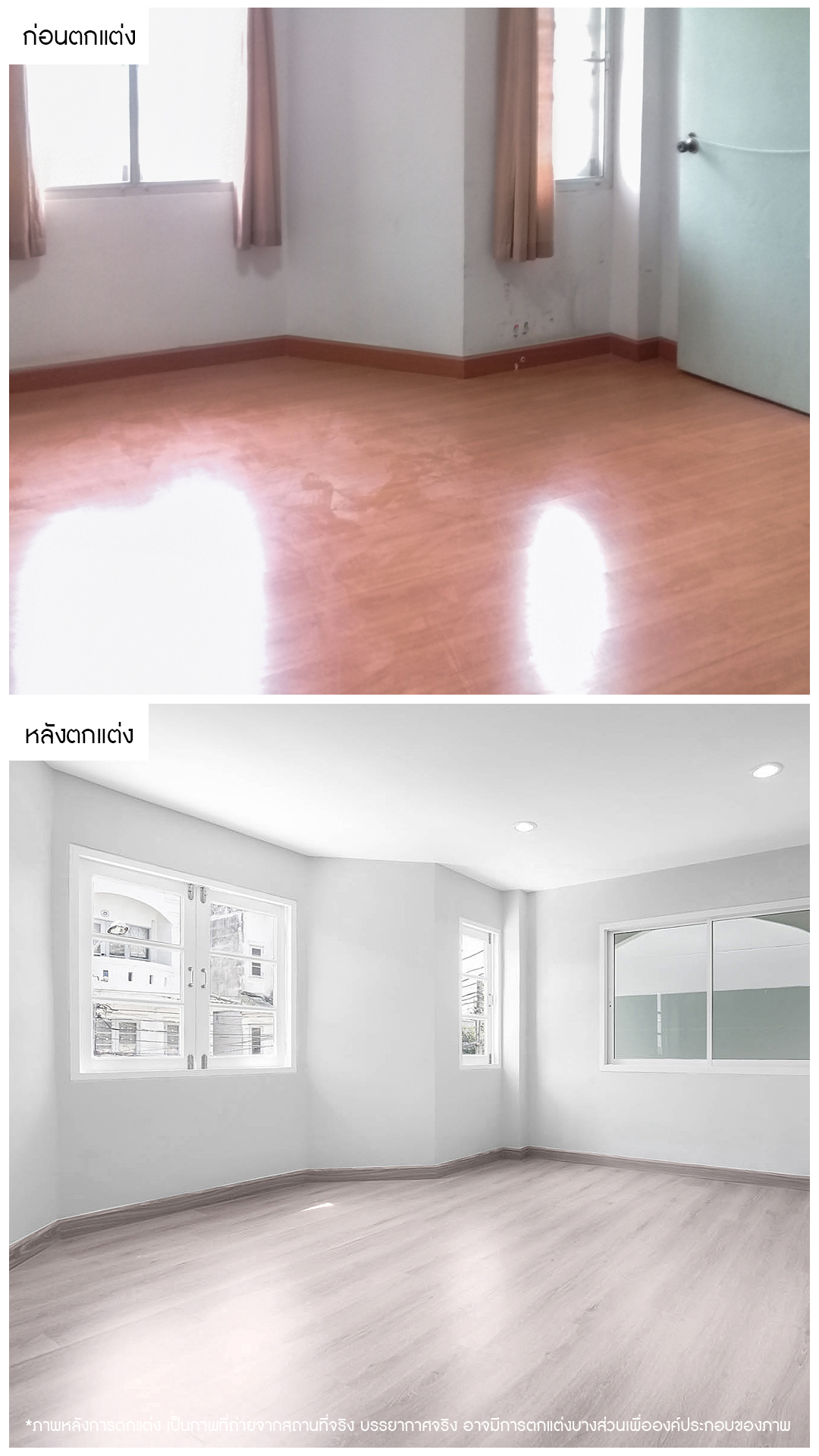 ในแต่ละห้องเราได้เปลี่ยนพื้นใหม่ให้เป็นลามิเนทที่มีความสวยงาม และคงทน เวลาเดินให้ความรู้สึกนุ่มเท้า และทำฝ้าเรียบติดไฟดาวน์ไลท์ เพื่อปรับโทนของห้องให้ดูอบอุ่น เหมาะแก่การพักผ่อน