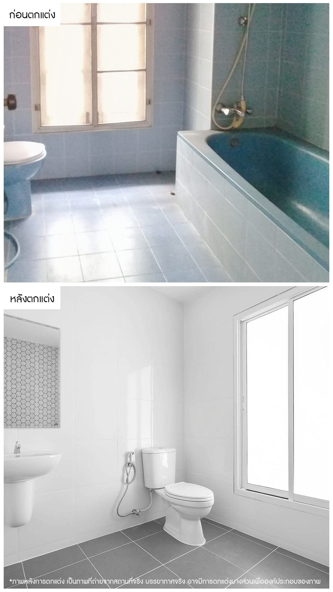 ในส่วนของห้องน้ำเราได้ออกแบบให้ดูโมเดิร์นขึ้น ปรับปรุงเพิ่มพื้นที่ใช้สอย พร้อมทั้งเปลี่ยนสุขภัณฑ์ให้ใหม่ทั้งหมด