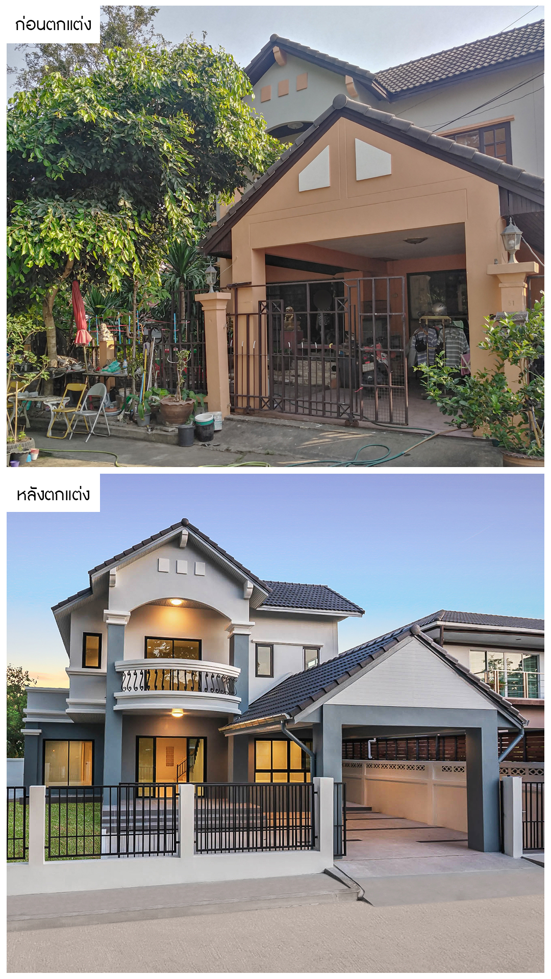 จากบ้านหลังเดิมที่สภาพเก่า สีซีดจาง และดูรกทึบ เราได้ทาสีใหม่ทั้งหลัง เปลี่ยนโทนสีภายนอกเป็นสีเทาฟ้าครามเพิ่มความโดดเด่นและดูโมเดิร์น และทำการเคลียร์พื้นที่หน้าบ้านและบริเวณบ้าน ให้กลับมามีพื้นที่ทำกิจกรรมอีกครั้ง พร้อมปรับเปลี่ยนรั้วที่ดูสวยงาม ทันสมัยรับกับตัวบ้าน