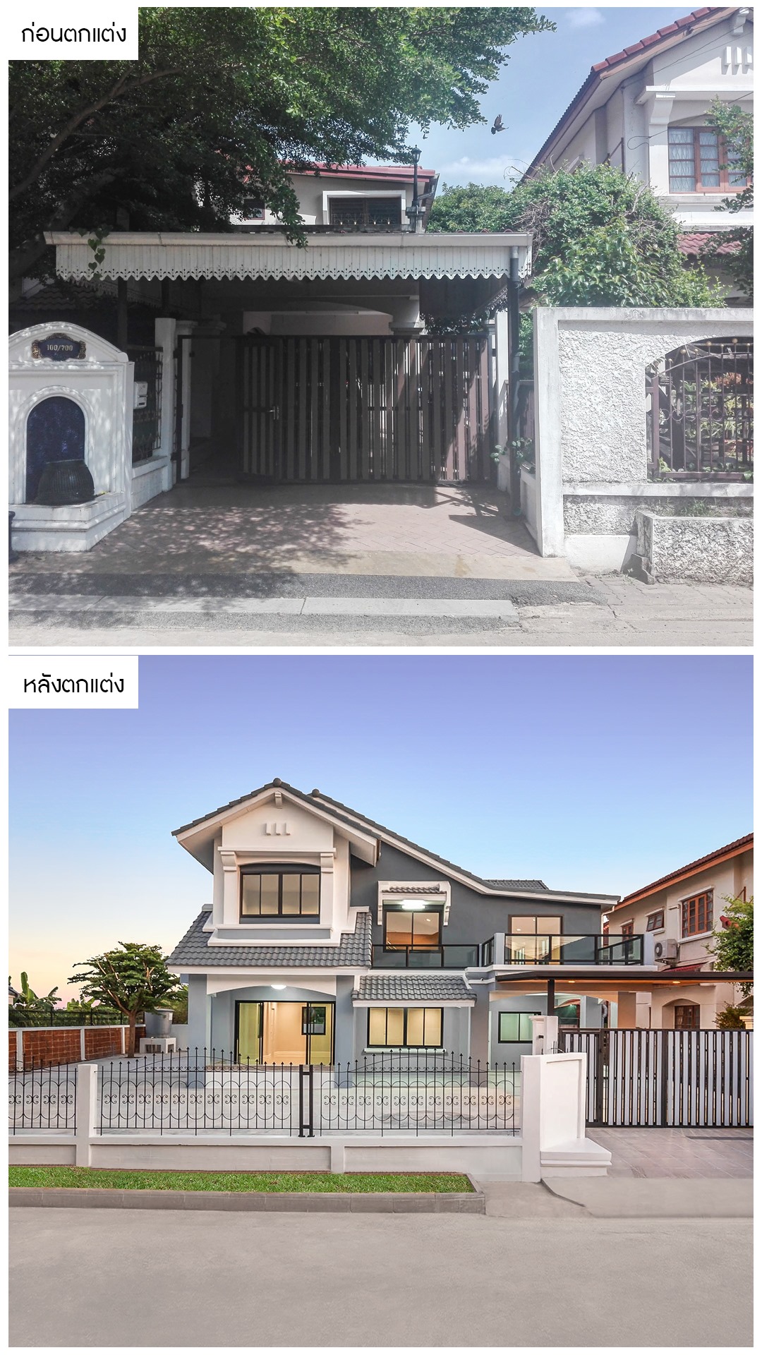 หน้าบ้านจากเดิมที่ปิดทึบ ทำให้บ้านดูไม่ปลอดโปร่ง และบริเวณบ้านดูคับแคบ เราได้ทำการปรับปรุงภูมิทัศน์รอบบ้าน ให้มีความโปร่งโล่งยิ่งขึ้น ทาสีให้เป็นโทนใหม่สวยสะดุดทุกสายตา