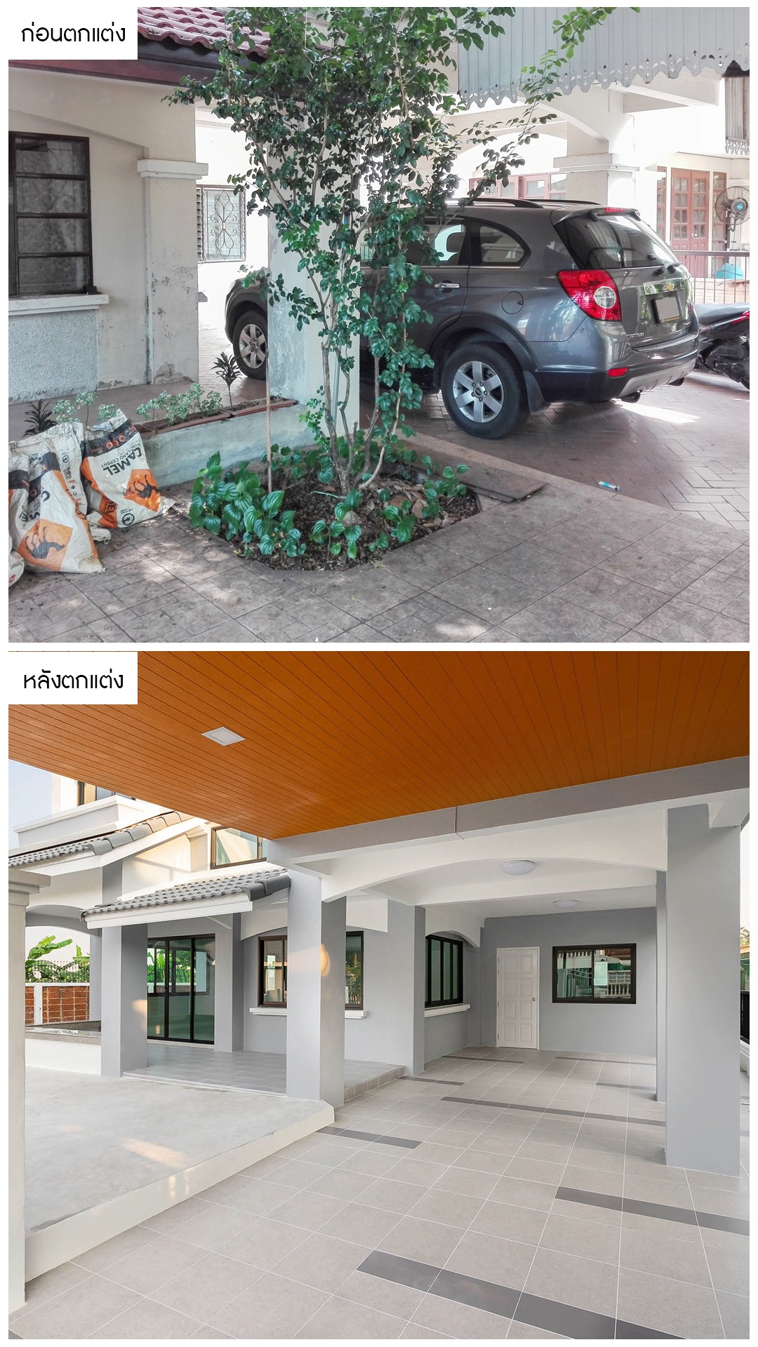 ในส่วนของพื้นที่จอดรถได้มีการปูพื้นใหม่ให้เป็นพื้นกันลื่น และทำหลังคาโรงจอดรถเป็นไม้ระแนงเพิ่มความสวยหรู และกันร้อนได้ดี
