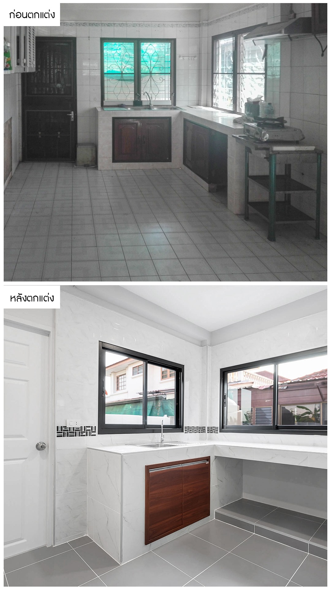 สำหรับห้องครัว ได้ทำการปรับปรุงใหม่ให้มีดีไซน์รับกับบ้านด้วยโทนสีขาว ตัดกับกระเบื้องพื้นสีเทา สวยงามลงตัว พร้อมเคาน์เตอร์ครัวที่ออกแบบด้วยการปูกระเบื้องจรดเพดานเพื่อให้ทำความสะอาดได้ง่าย ครบครันทุกการใช้งาน