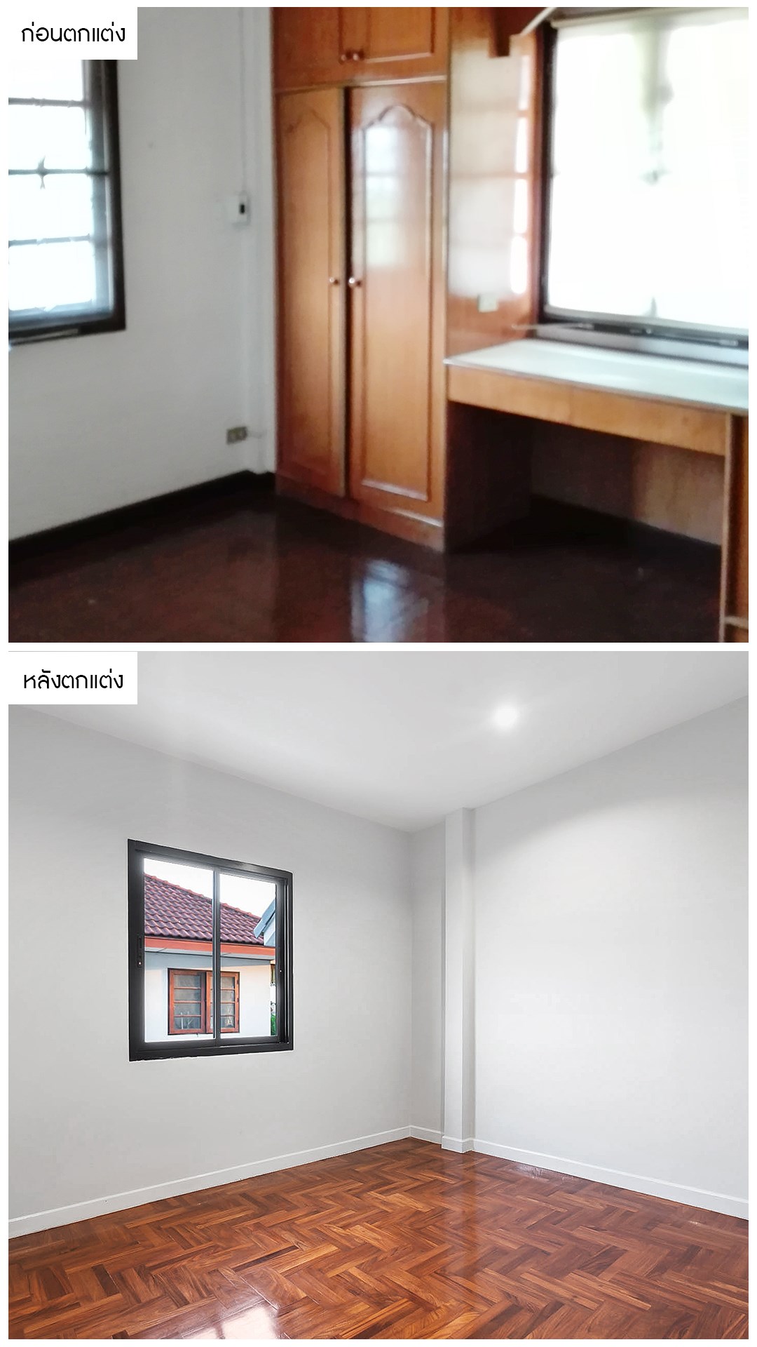 ห้องนอนได้รับการปรับปรุงใหม่ โดยทาสีภายในเป็นโทนสว่าง ปรับเพดานใหม่ให้เป็นแบบฝ้าเรียบ พร้อมสร้างบรรยากาศสุดอบอุ่นด้วยไฟดาวน์ไลท์