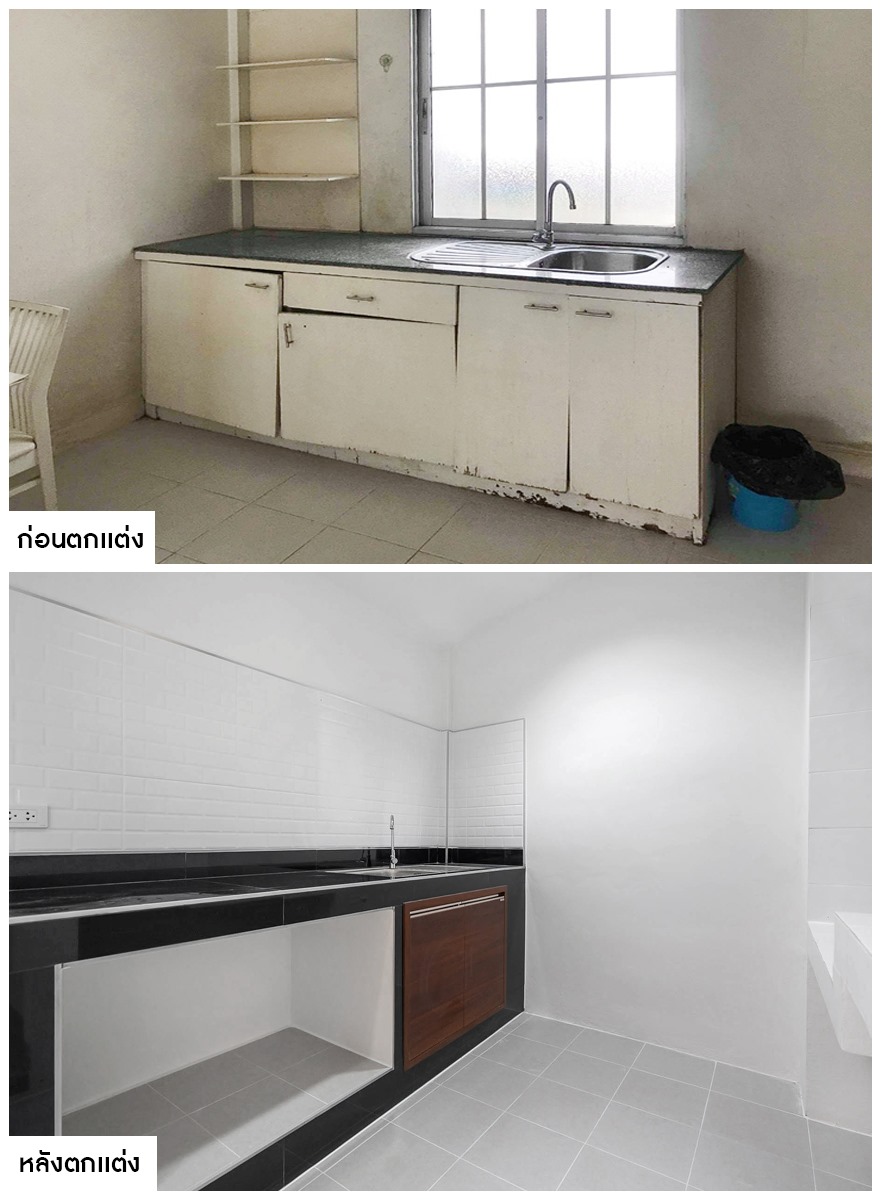 จากเดิมที่เคาน์เตอร์ครัวสภาพเก่าทรุดโทรมใช้การไม่ได้ เราได้ทำการต่อเติมครัวเคาน์เตอร์แบบพร้อมใช้งาน และมีความทันสมัย ปูกระเบื้องแบบขัดมัน ง่ายต่อการทำความสะอาด ทาสีใหม่สว่างสดใส น่าใช้งาน ตอบโจทย์ทุกการอยู่อาศัย