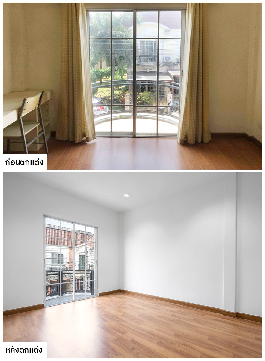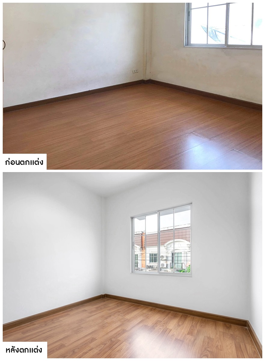 นอกจากจะเปลี่ยนพื้นแบบเก่าให้เป็นพื้นลามิเนตแบบสวยงามแล้ว เรายังเปลี่ยนสีห้องนอนให้เป็นโทนสีขาว สะอาดตา น่าอยู่อาศัย