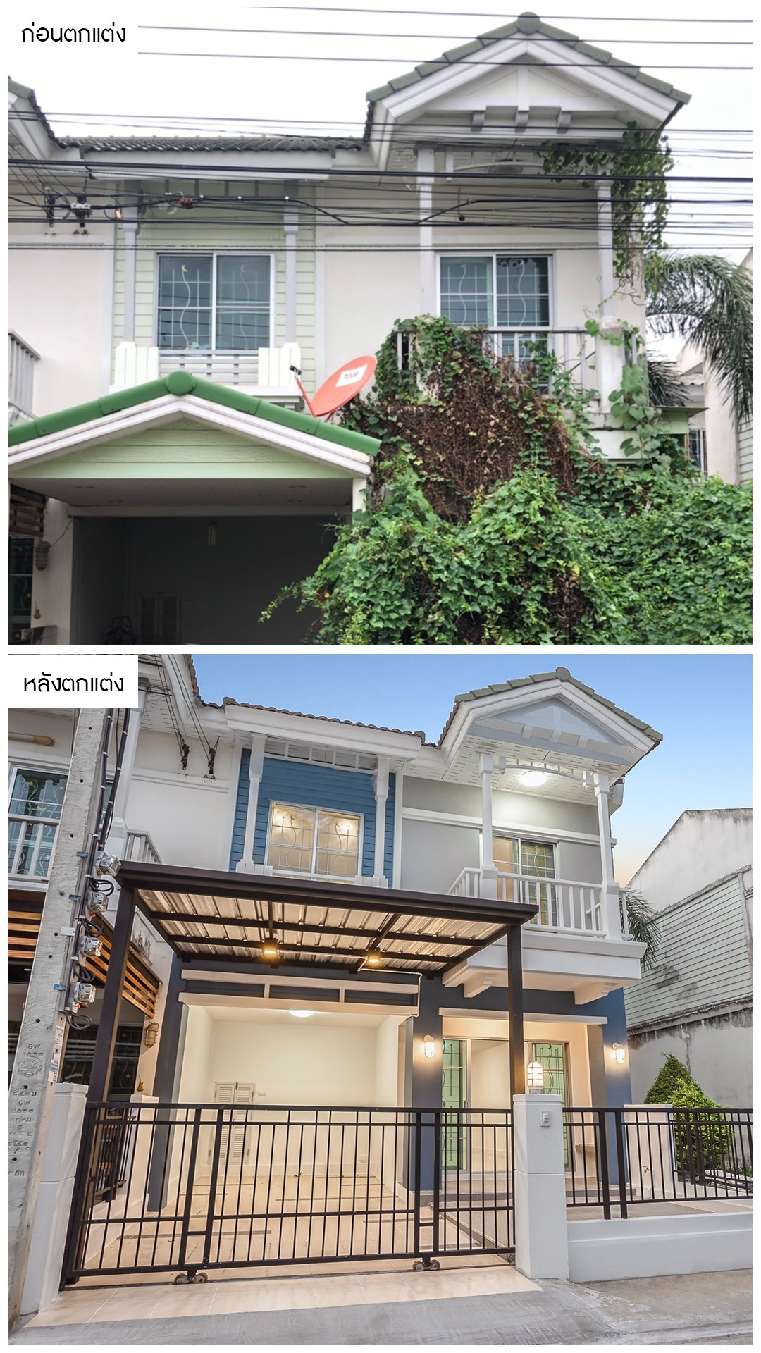 จากบ้านที่ดูรกครึ้ม ด้วยวัชพืชต่างๆ ที่ทำให้บ้านดูรกร้าง เราได้ทำการปรับปรุงพื้นที่ เคลียร์ต้นไม้ที่รกออก ทาสีใหม่ เปลี่ยนโทนสี ให้โดดเด่น สดใส และทำโรงจอดรถใหม่ ให้ดูโปร่งโล่งขึ้น โดยหลังคาโรงรถใช้เป็น เมทัลชีทกันความร้อน นอกจากนั้นเรายังปูพื้น ด้วยกระเบื้องกันลื่น ลายสุดโดดเด่น ที่เป็นเอกลักษณ์สไตล์บ้านบางกอก