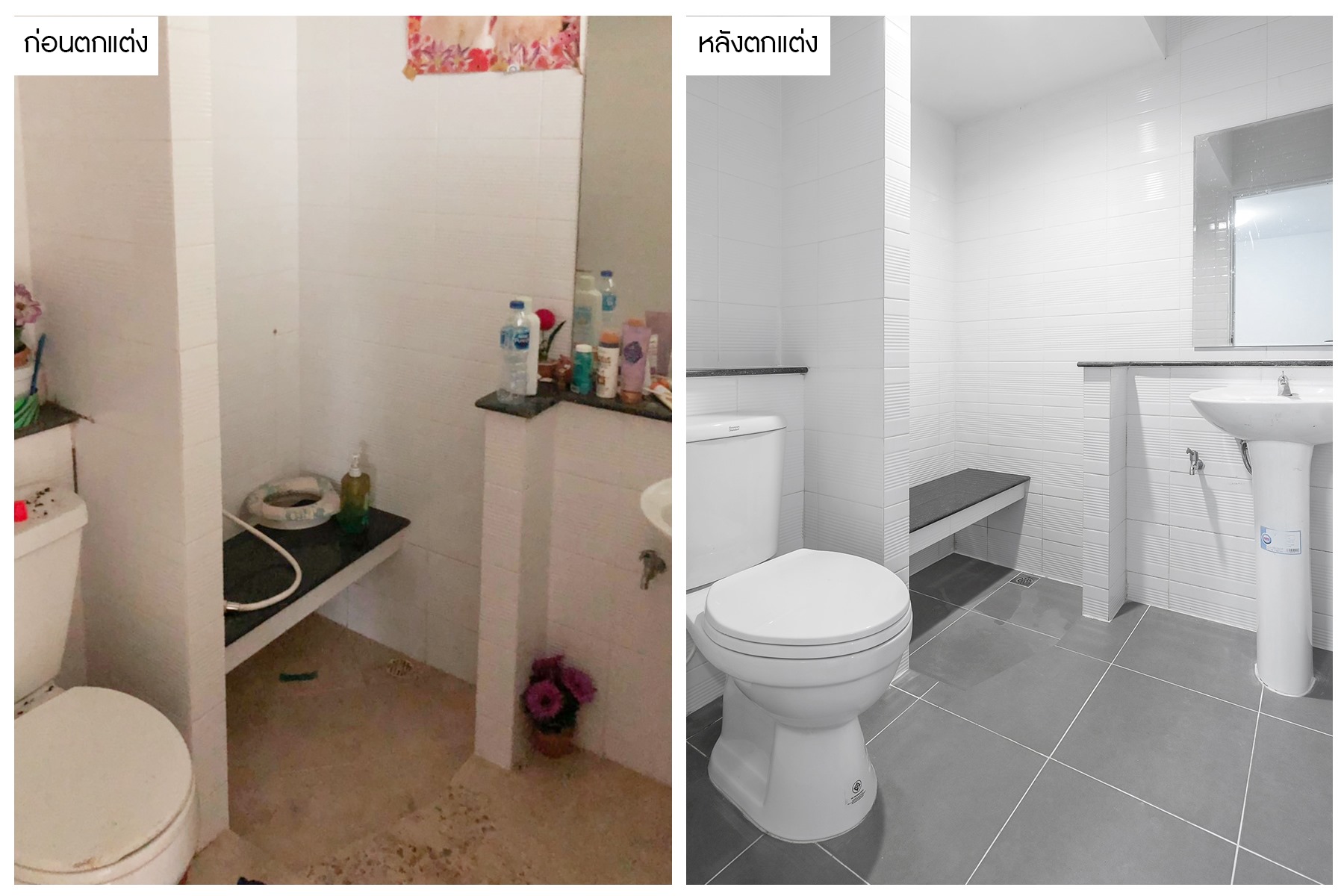 จากเดิมที่ห้องน้ำมีสภาพเก่า ไม่เหมาะแก่การใช้งาน เราได้ทำการตกแต่งใหม่ด้วยวัสดุคุณภาพดี ทั้งพื้นกระเบื้องกันลื่น และสุขภัณฑ์ในห้องน้ำ เพื่อให้ดูสะอาด และน่าใช้งานมากยิ่งขึ้น บอกได้เลยว่าครบครันทุกการใช้งานจริงๆ ครับ