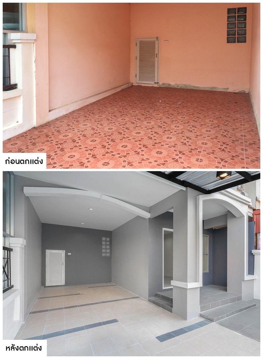 ในส่วนของพื้นโรงรถ เราได้ทำการเปลี่ยนพื้นกระเบื้องเก่าๆ ให้เป็นพื้นแบบกันลื่นลวดลายเฉพาะของบ้านบางกอกที่ดูทันสมัยและทำให้บ้านมีความโดดเด่นยิ่งขึ้น
