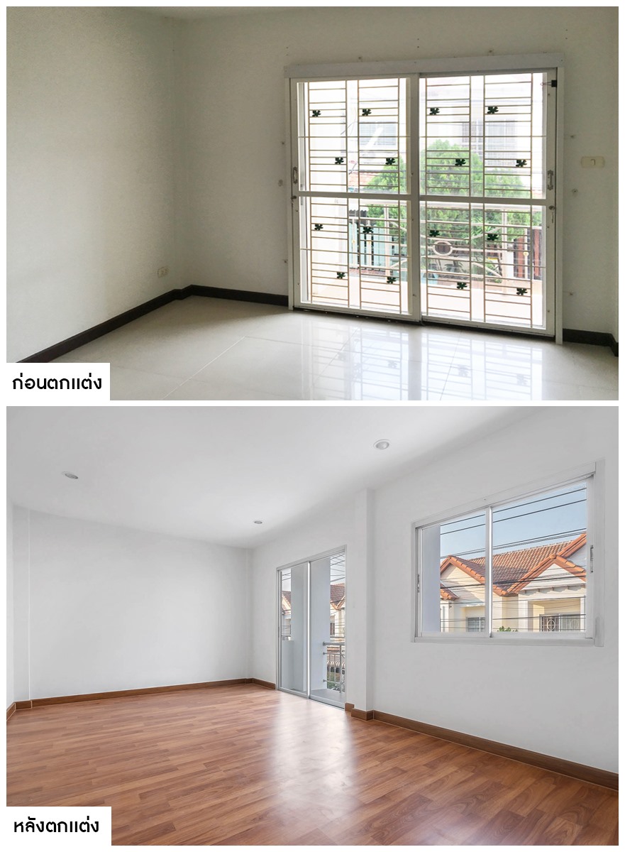 ห้องนอนปูด้วยพื้นลามิเนต ที่มีความสวยงามและคงทน มาพร้อมไฟดาวน์ไลท์ ที่นอกจากให้ความสวยงามแล้ว ยังช่วยให้บ้านดูมีมิติขึ้น อีกทั้งได้เปลี่ยนโทนสีภายในให้เป็นสีโทนอ่อน ที่ให้ความรู้สึกอบอุ่น บ้านสว่างและโปร่งกว้างอีกด้วยครับ