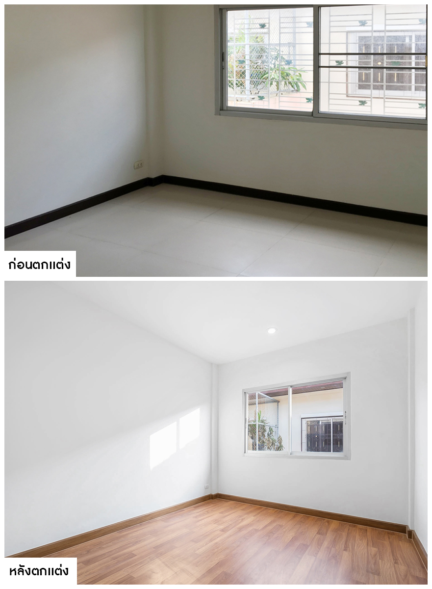 ห้องนอนเล็กก็ดูกว้างขึ้นด้วยสีโทนอ่อน ที่ให้ความรู้สึกอบอุ่น ชวนผ่อนคลาย และปูด้วยพื้นลามิเนต ที่มีความสวยงามและคงทน มาพร้อมหน้าต่างกระจกเลื่อนบานใหญ่ ที่สามารถเปิดรับลมและแสงธรรมชาติได้อย่างเต็มที่