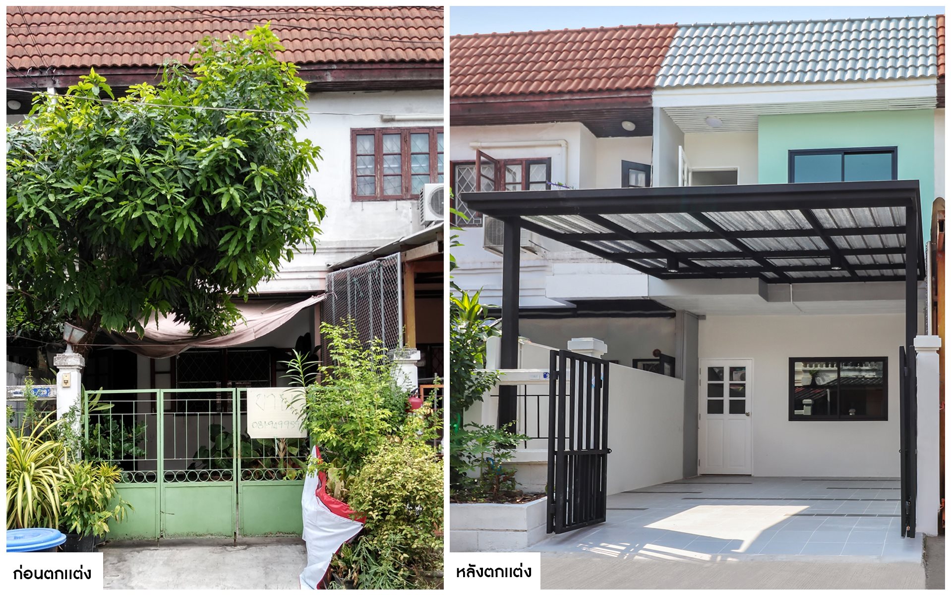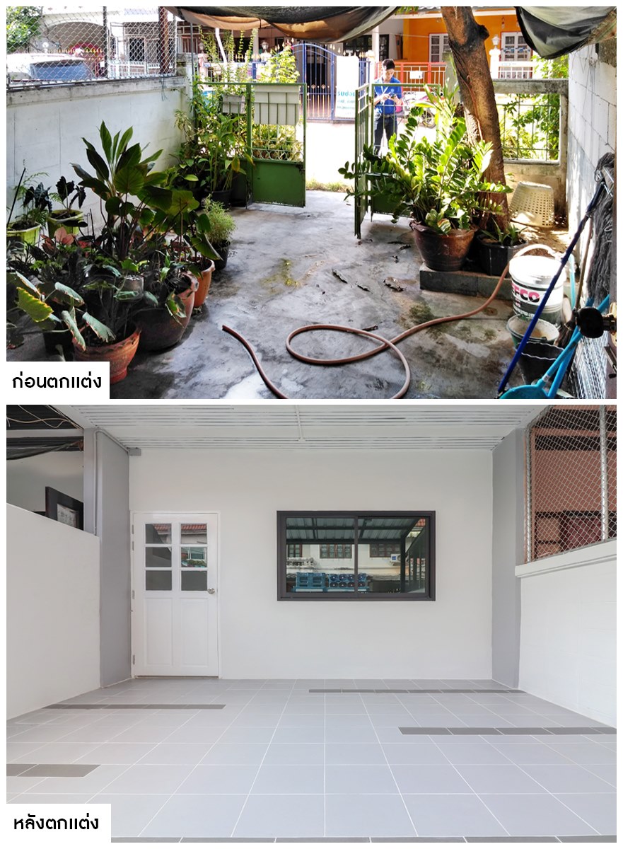 โรงรถเราได้เคลียร์พื้นที่จากเดิมที่รกทึบจนไม่สามารถจอดรถได้ ให้มีความโปร่งกว้าง พร้อมทั้งปูพื้นด้วยกระเบื้องแบบกันลื่น ประกอบกับต่อเติมหลังคาโดยใช้เพดานแบบระแนงไม้เฌอร่า ที่ทาเป็นสีขาวดูสะอาดตา