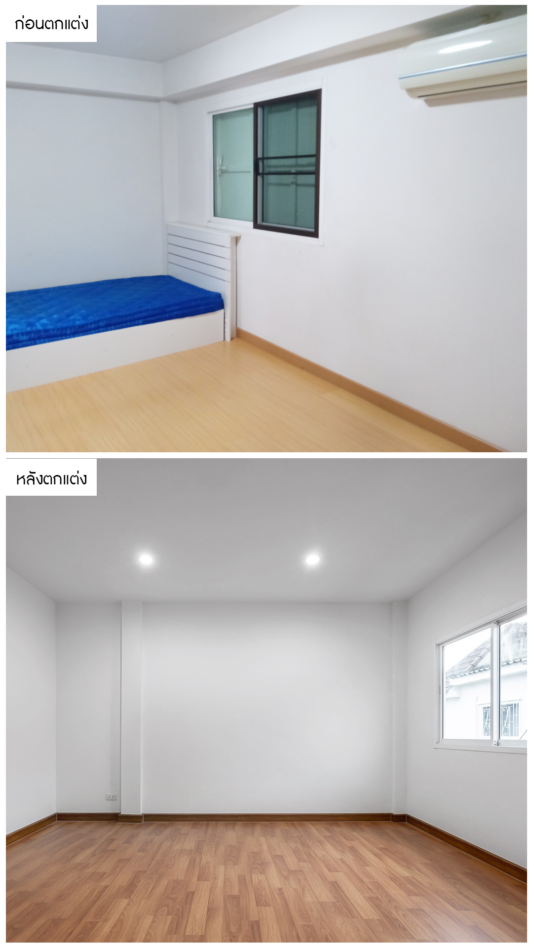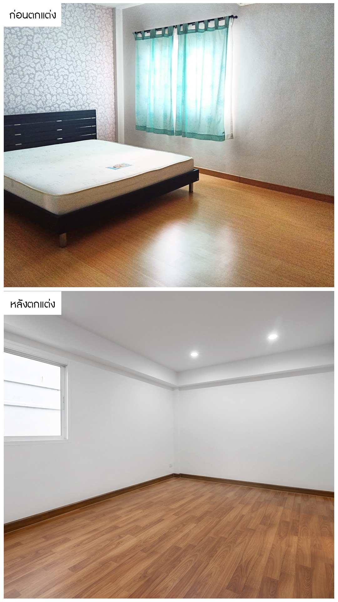 ห้องนอนเราได้ทำการเปลี่ยนพื้นเป็นพื้นลามิเนต เพดานใหม่แบบฉาบเรียบ และหน้าต่างแบบกระจกบานเลื่อน รวมทั้งไฟแบบดาวน์ไลท์ ที่นอกจากจะช่วยสร้างบรรยากาศที่อบอุ่นแล้ว ยังทำให้ห้องดูผ่อนคลาย และมีมิติมากขึ้นด้วยครับ