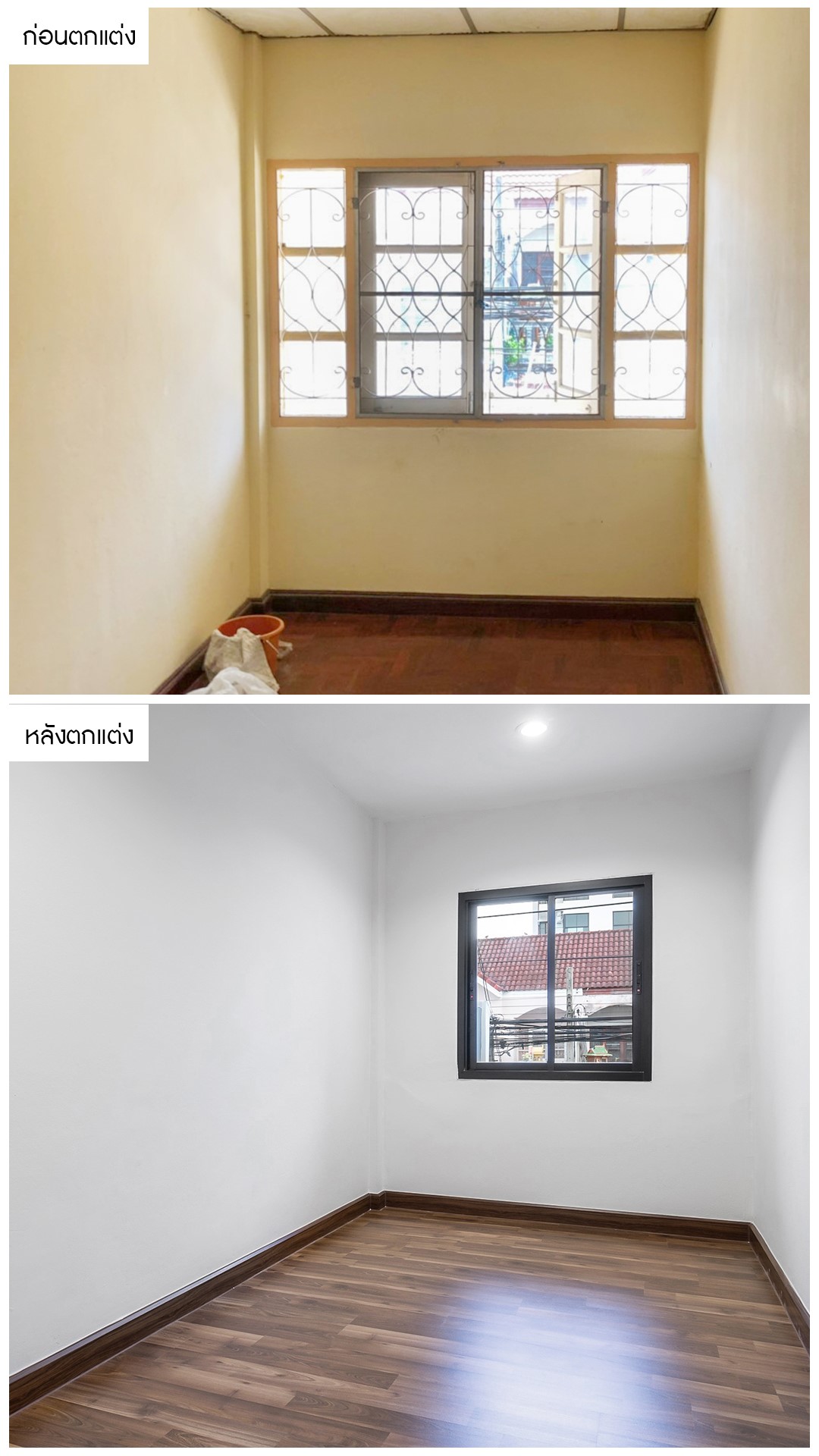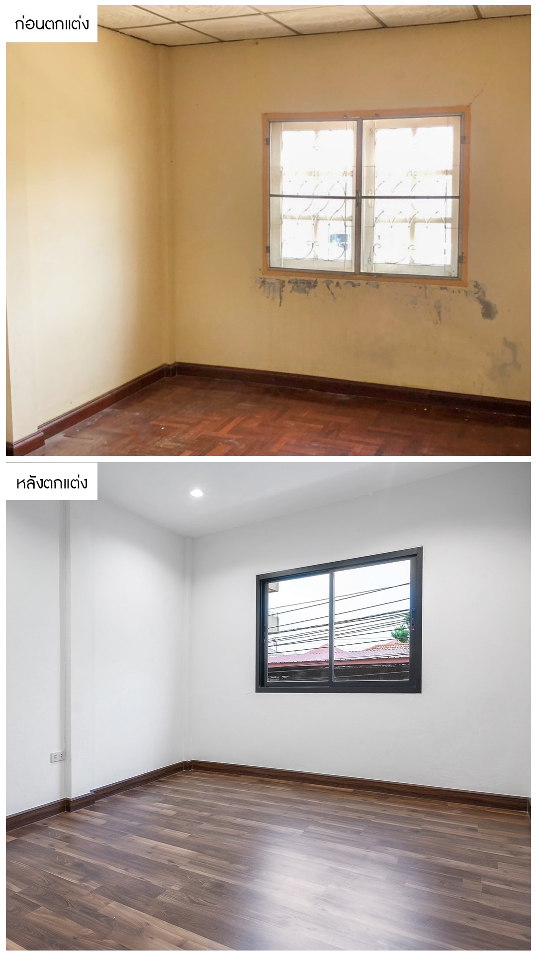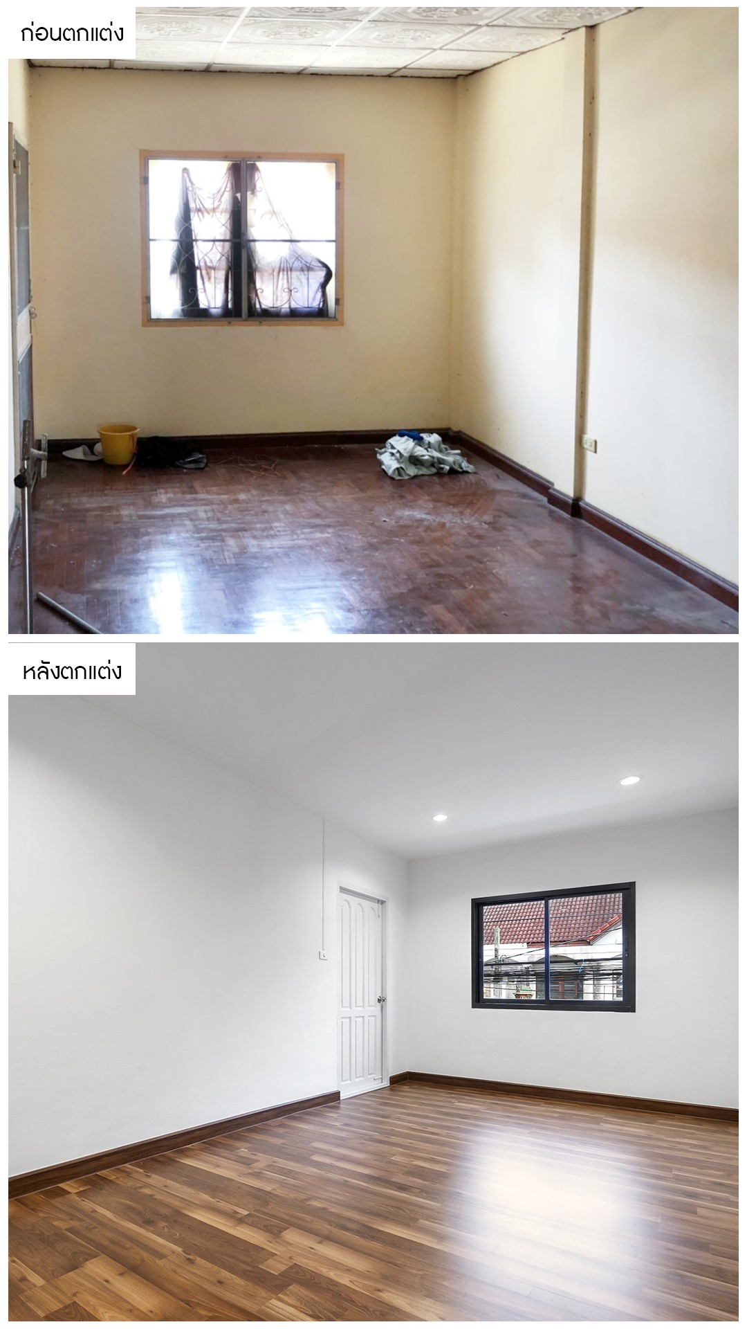 ห้องนอนจากเดิมที่ดูเก่า ฝ้าเพดานชำรุด เราได้รีโนเวทใหม่ทั้งหมด โดยเปลี่ยนพื้นเป็นพื้นลามิเนต ที่มีทั้งความสวยงาม และคงทน พร้อมเปลี่ยนโทนสีภายในห้องเพื่อให้สบายตา ทำให้ห้องดูสว่าง และให้ความรู้สึกอบอุ่น มาพร้อมโคมไฟแบบดาวน์ไลท์ที่ทั้งสวยงามและประหยัดไฟอีกด้วยครับ