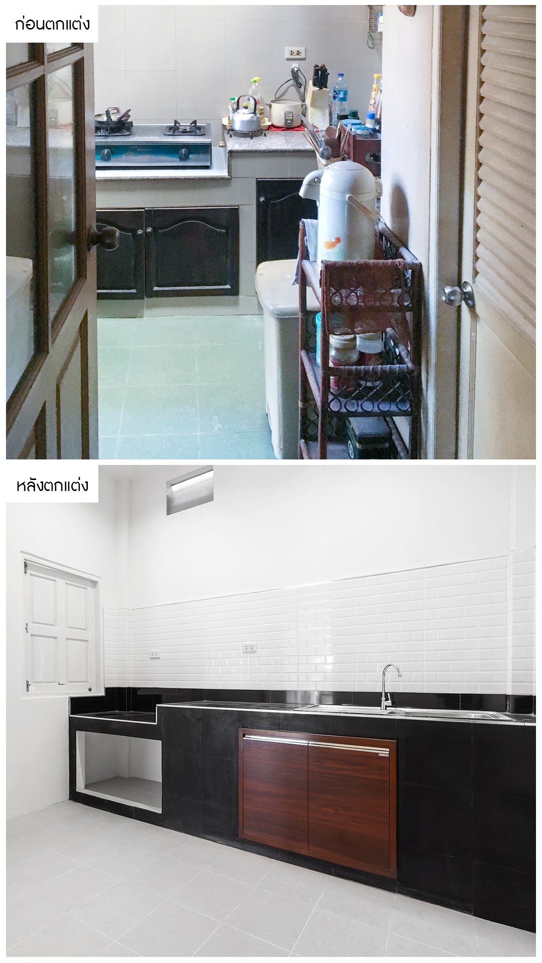 เปลี่ยนครัวดีไซน์เก่า ให้เป็นครัวใหม่สไตล์โมเดิร์น เน้นโทนสีภายในเป็นสีขาวสะอาดตา พร้อมครัวเคาน์เตอร์ที่ครบครันทุกการใช้งานกันเลยทีเดียวครับ