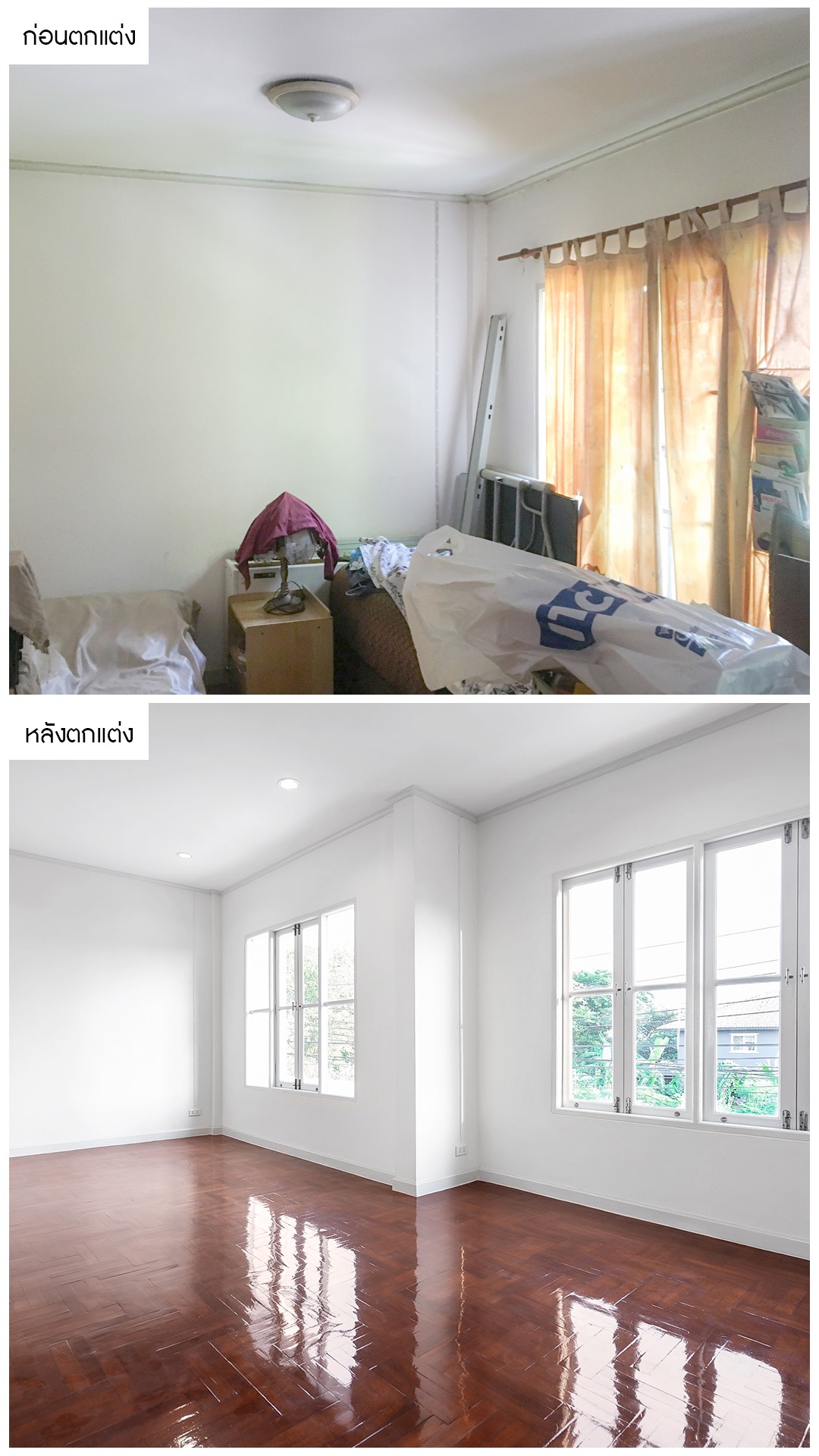 ห้องนอนกว้างขวางด้วยสีโทนอ่อน พร้อมโคมไฟแบบดาวน์ไลท์ ที่ให้ความสว่างและยังทำให้ห้องดูมีมิติยิ่งขึ้นด้วย นอกจากนี้เรายังเปลี่ยนพื้นแบบเก่า ให้เป็นพื้นแบบลามิเนตที่ทั้งสวยงาม และง่ายต่อการทำความสะอาดอีกด้วยครับ