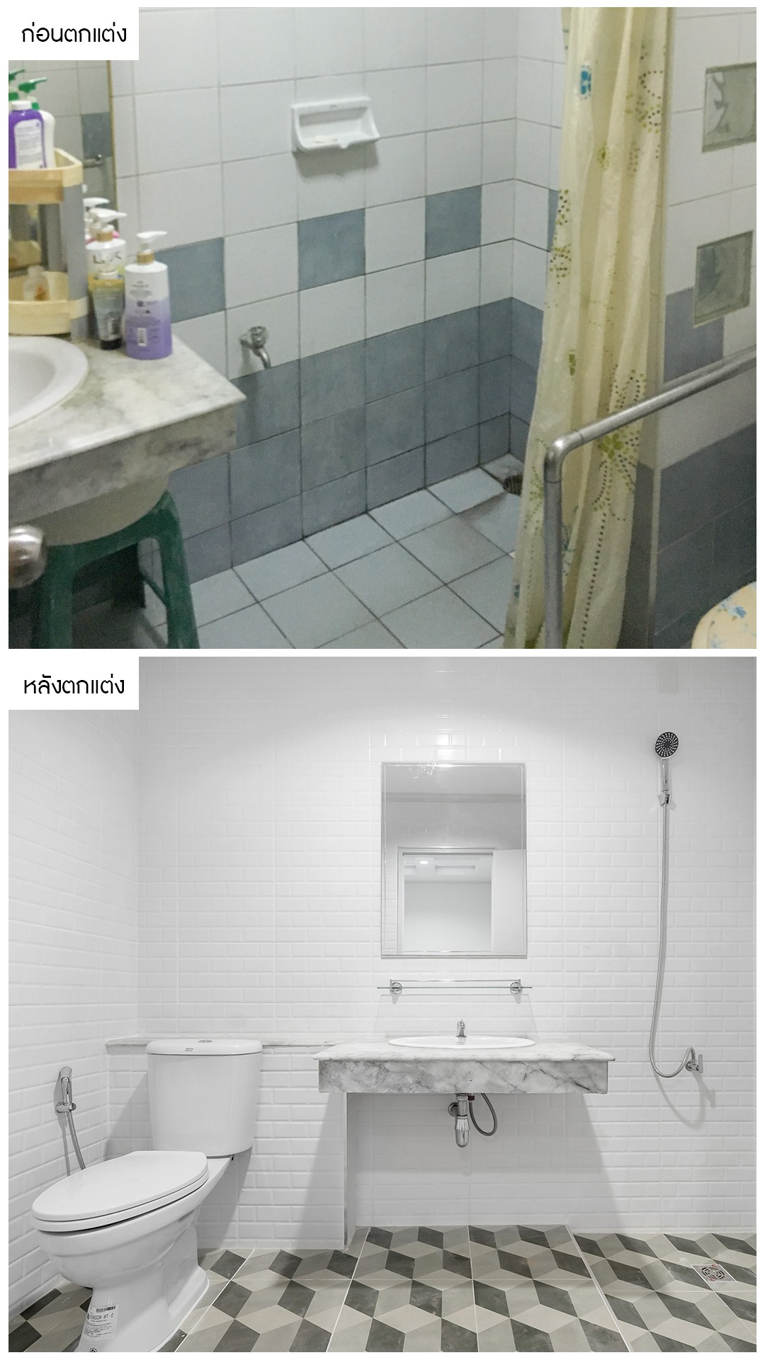 จากเดิมห้องน้ำที่ดูเก่า ไม่พร้อมใช้งาน เราได้ตกแต่งให้ใหม่ทั้งหมด ด้วยวัสดุคุณภาพดี ครบครันทั้งอ่างล้างหน้า ฝักบัว กระเบื้องกันลื่นและสุขภัณฑ์ ในส่วนของผนัง เราก็ปูกระเบื้องตั้งแต่พื้นจรดเพดาน เพื่อให้ง่ายต่อการทำความสะอาด
