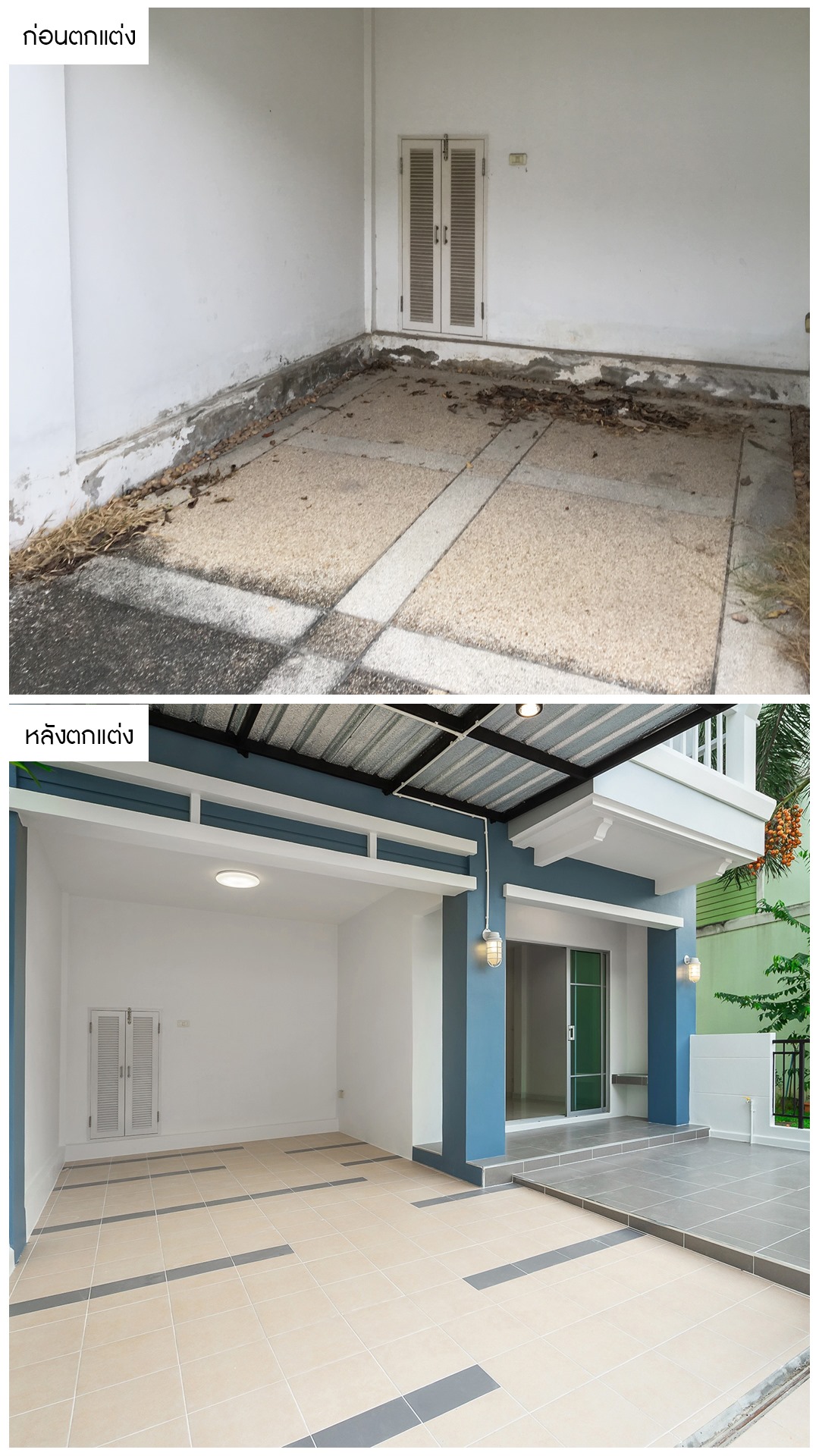 จากเดิมที่โรงรถดูเก่ามาก และไม่มีหลังคา เราได้ต่อเติมหลังคาโรงรถเป็นแบบเมทัลชีทกันความร้อน พร้อมปูพื้นด้วยกระเบื้องกันลื่น ลวดลายสุดโดดเด่นที่เป็นเอกลักษณ์สไตล์บ้านบางกอก และเน้นให้หน้าบ้านมีความโปร่ง กว้างยิ่งขึ้นครับ