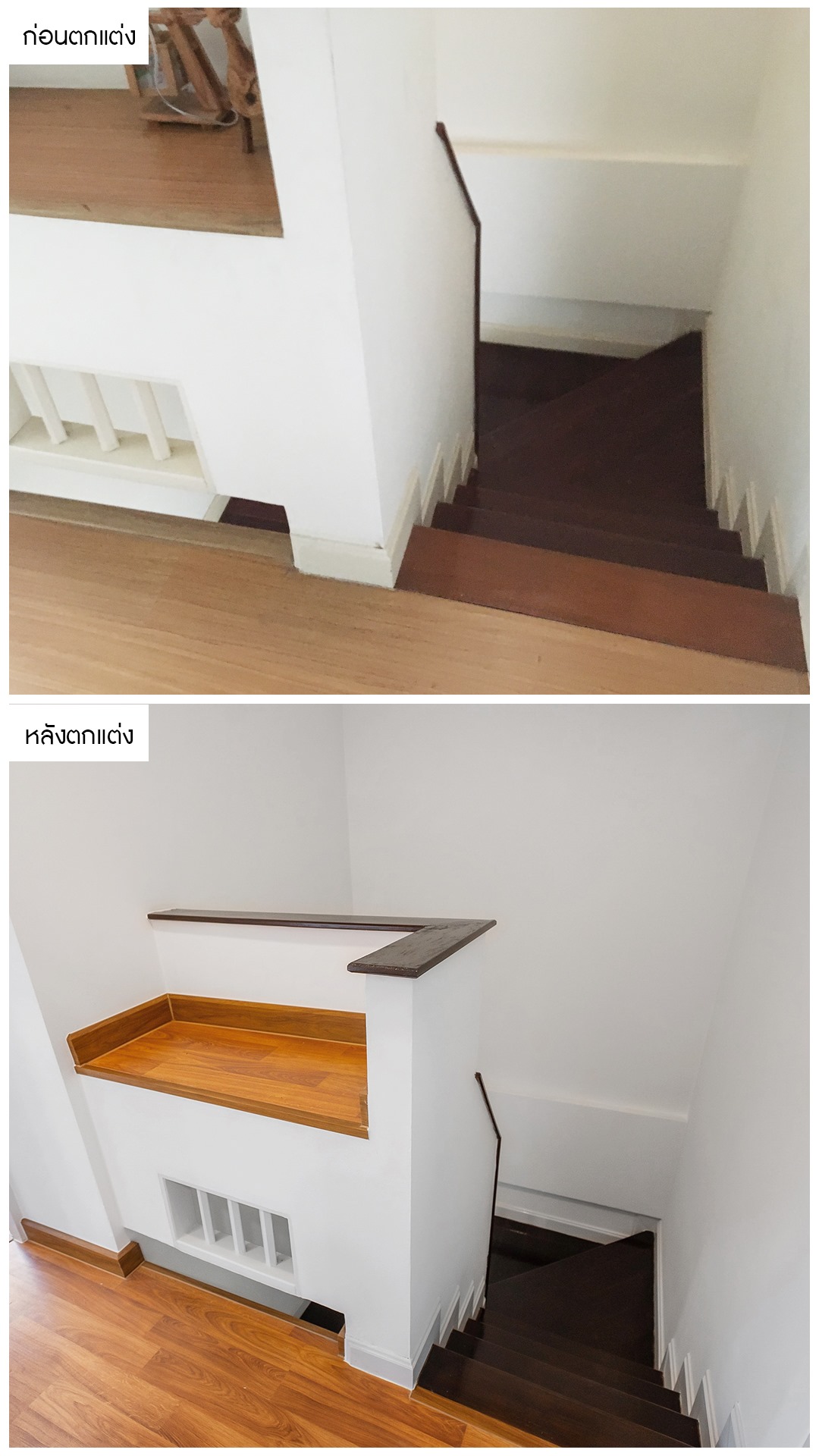 โถงบันไดเราได้ปรับปรุงมุมด้านข้างให้มีพื้นที่ใช้สอยเพิ่มมากขึ้น และเปลี่ยนพื้นให้สวยงามด้วยพื้นลามิเนตที่เป็นที่นิยมในบ้านมือ1อีกด้วยครับ