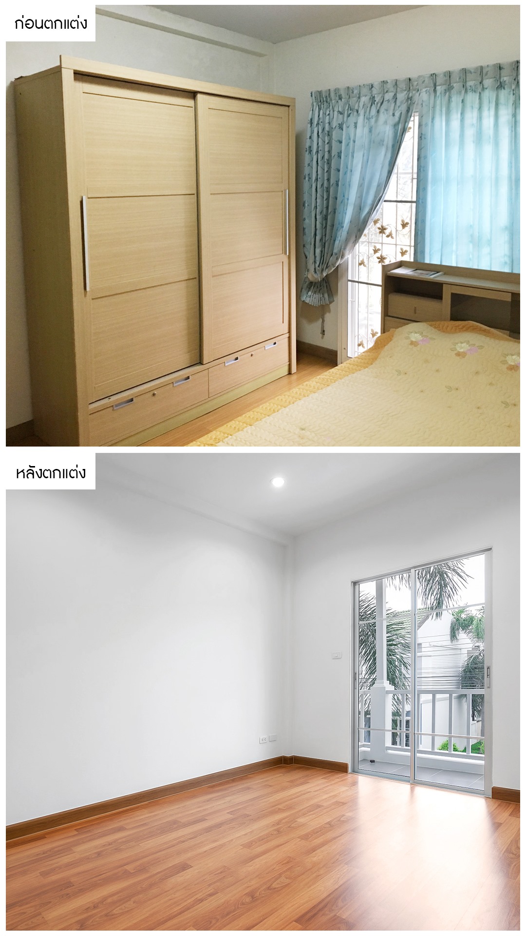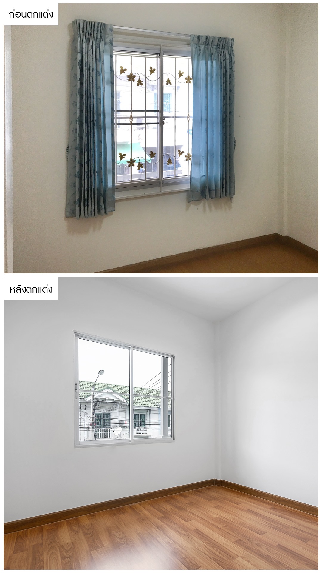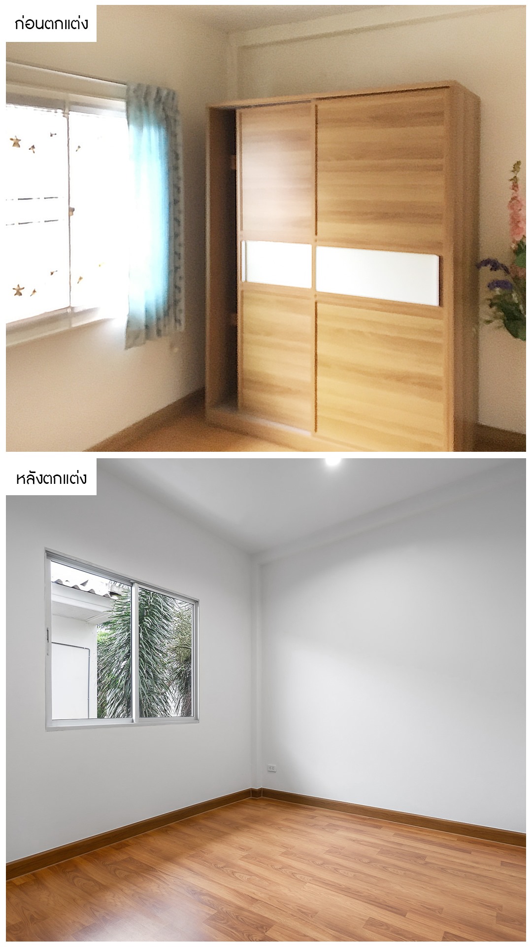 ห้องนอนที่สภาพดูเก่า เราได้เปลี่ยนให้สวยงามด้วยพื้นลามิเนต พร้อมเปลี่ยนโทนสีภายในห้องให้ดูสว่างมากยิ่งขึ้น และปรับปรุงหน้าต่างเป็นแบบกระจกบานเลื่อนเพื่อเปิดรับแสงธรรมชาติจากภายนอกครับ