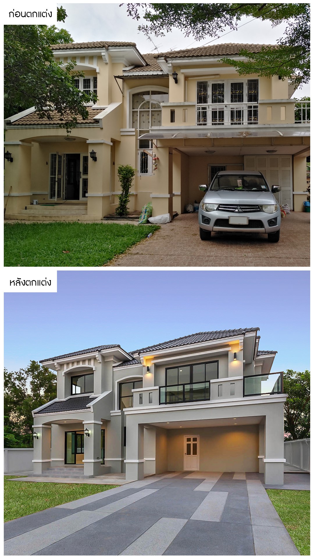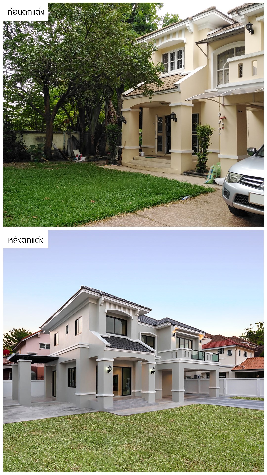 จากบ้านหลังเดิมที่สภาพสีซีดจางไปตามกาลเวลา เราได้ทาสีใหม่ทั้งหลังเป็นขาวตัดเทาเพิ่มความโดดเด่นและโมเดิร์นให้ตัวบ้านและตกแต่งด้วยวัสดุคุณภาพพรีเมี่ยมทำให้บ้านสวยงาม น่าอยู่อาศัยมากขึ้น