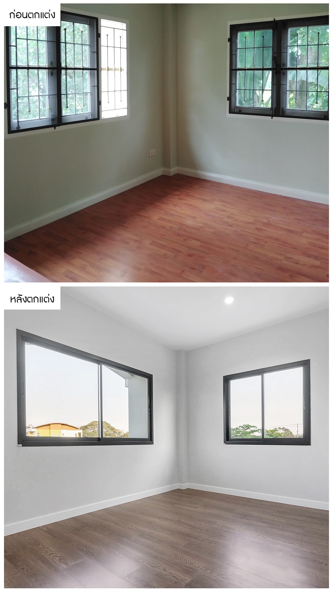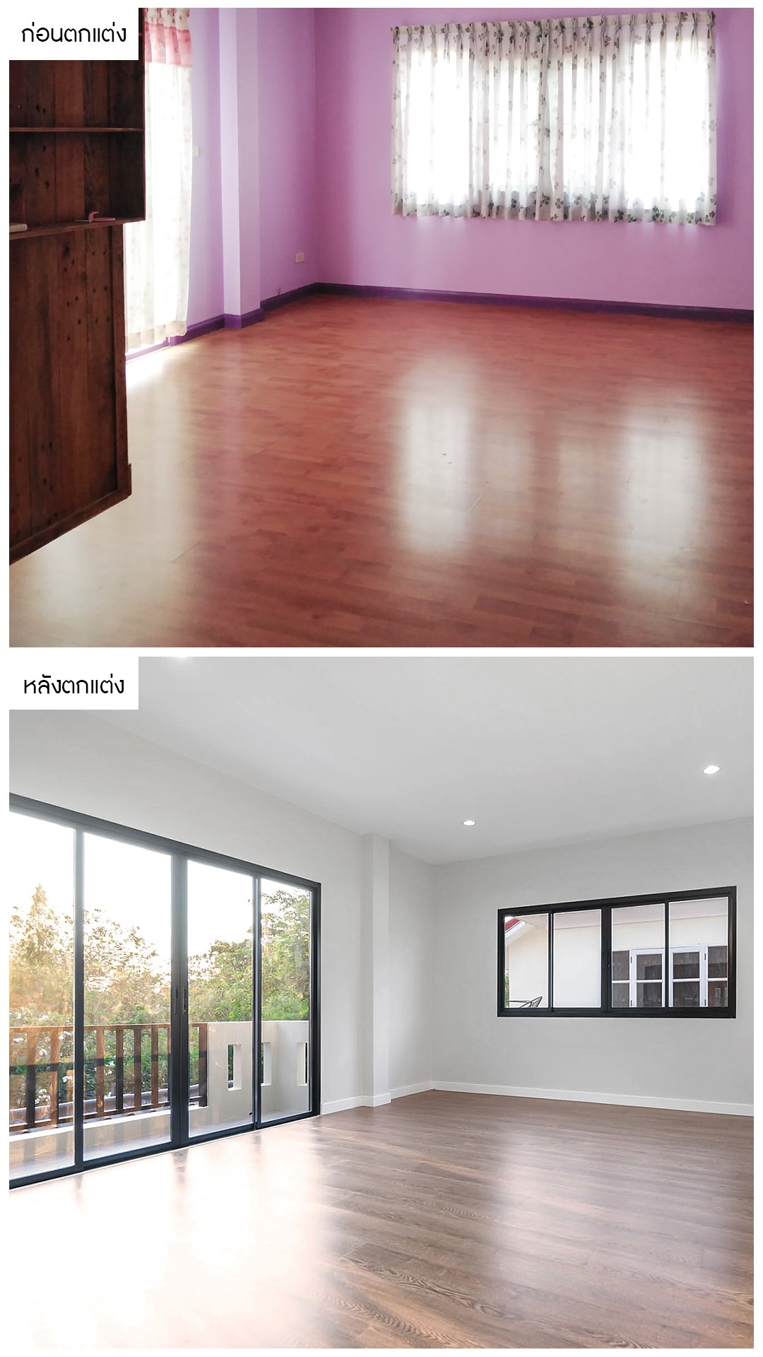 จากเดิมที่มีสภาพเก่า ดูไม่ทันสมัยไม่เหมาะแก่การพักผ่อน เราได้เปลี่ยนให้ใหม่ด้วยพื้นลามิเนตที่ทั้งสวยงาม คงทนและนิยมใช้ในบ้านยุคใหม่ นอกจากนั้นยังเปลี่ยนโทนสีภายในห้องเป็นโทนขาวดูสว่างสะอาดตามากยิ่งขึ้น พร้อมประตู-หน้าต่างกระจกบานใหญ่รอบด้าน เชื่อมต่อระเบียง ให้ความรู้สึกผ่อนคลายและสามารถรับแสงธรรมชาติได้อย่างเต็มที่