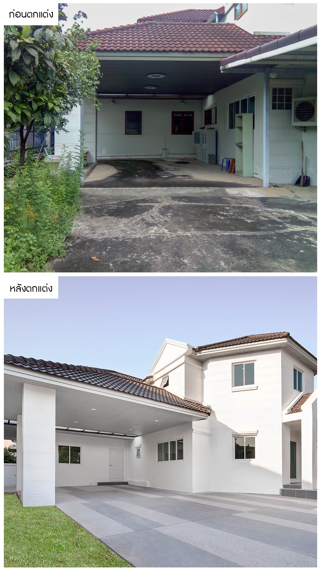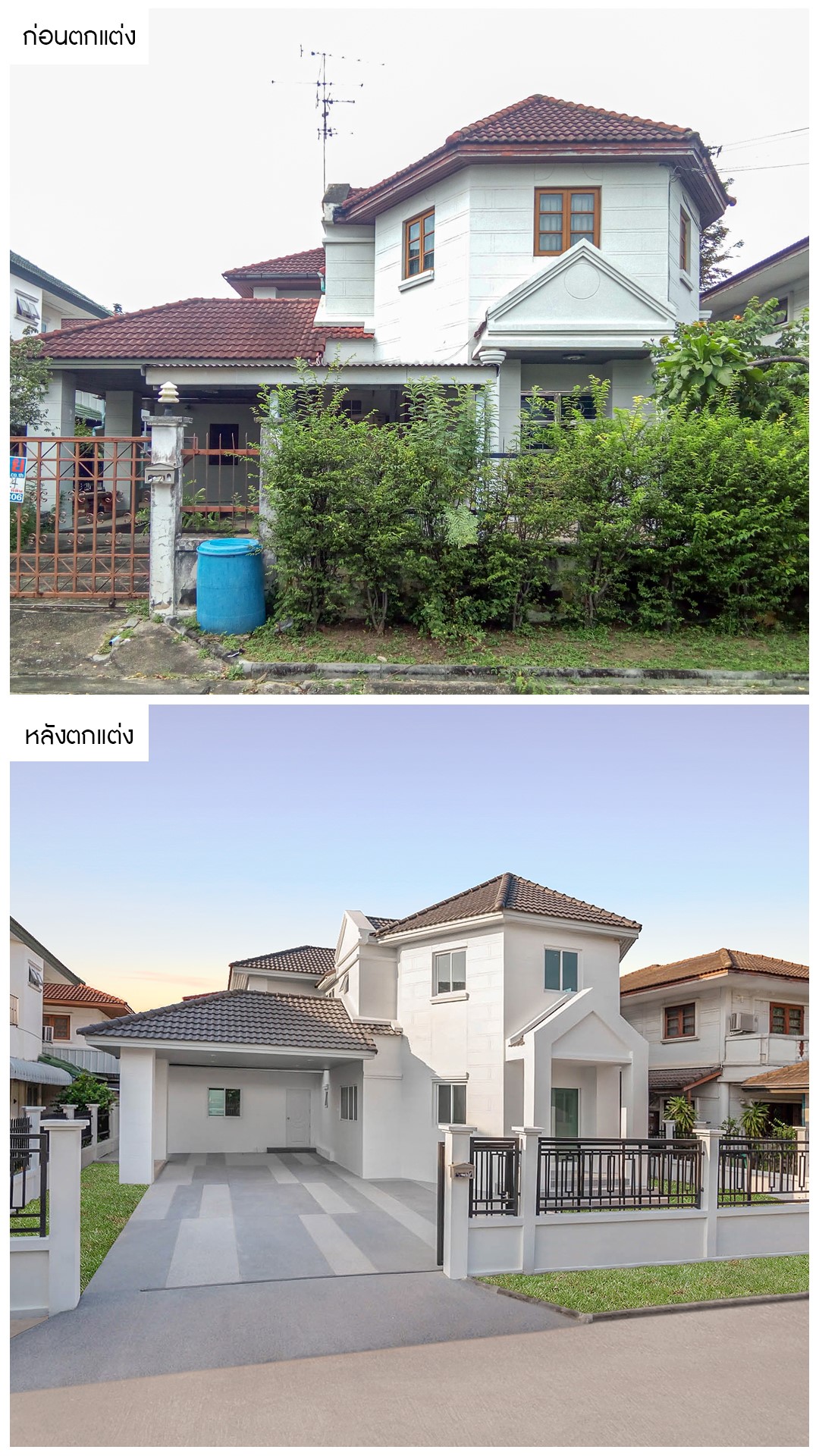จากบ้านเดิมที่ดูเก่า เราได้ทำการปรับปรุงใหม่ทั้งหมด ตั้งแต่การเคลียร์พื้นที่หน้าบ้าน ต้นไม้ที่เคยรกก็เอาออกทั้งหมดเพื่อทำให้พื้นที่สนามหญ้าด้านข้างกลับมาพร้อมทำกิจกรรมอีกครั้ง จากนั้นเราก็ได้ทาสีใหม่ทั้งหลัง เน้นโทนขาวนวลสว่าง เพื่อให้ความรู้สึกผ่อนคลายน่าอยู่อาศัย พร้อมเปลี่ยนเป็นรั้วแบบทันสมัยรับกับตัวบ้าน เหมือนได้บ้านหลังใหม่เลยครับ