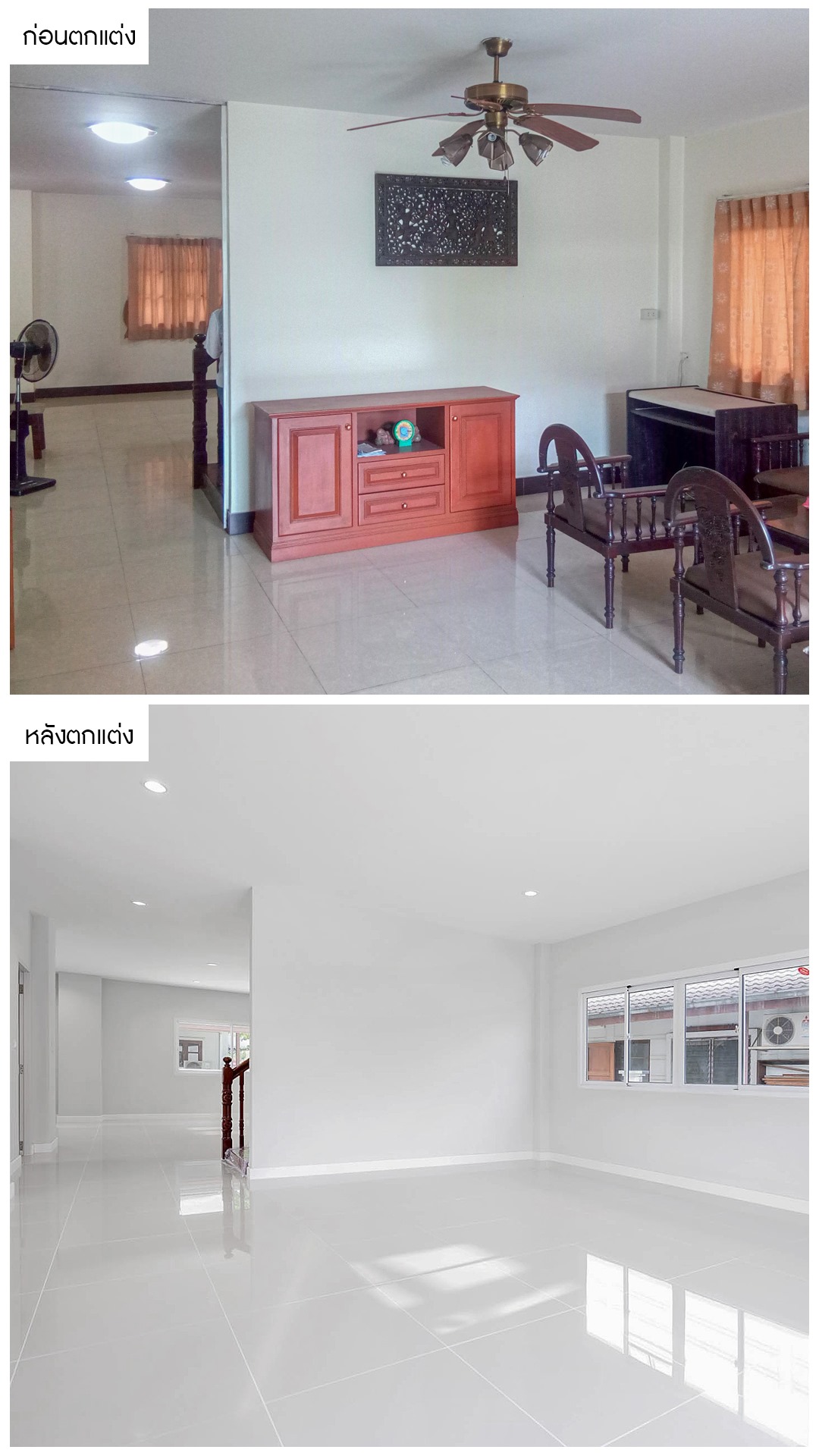 ด้วยโครงสร้างของบ้านที่ยังแข็งแรงดี เราจึงปรับปรุงในส่วนของการทาสีภายในให้ใหม่ทั้งหมดให้เป็นโทนขาวสว่าง จะทำให้บ้านดูโปร่งกว้าง บรรยายกาศผ่อนคลายมีชีวิตชีวาขึ้นครับ และปูพื้นใหม่ด้วยกระเบื้องแกรนิโต้แผ่นใหญ่ที่นิยมใช้ในบ้านสมัยใหม่ สวยงามและคงทน พร้อมไฟดาวน์ไลท์ช่วยให้บ้านมีมิติมากขึ้น