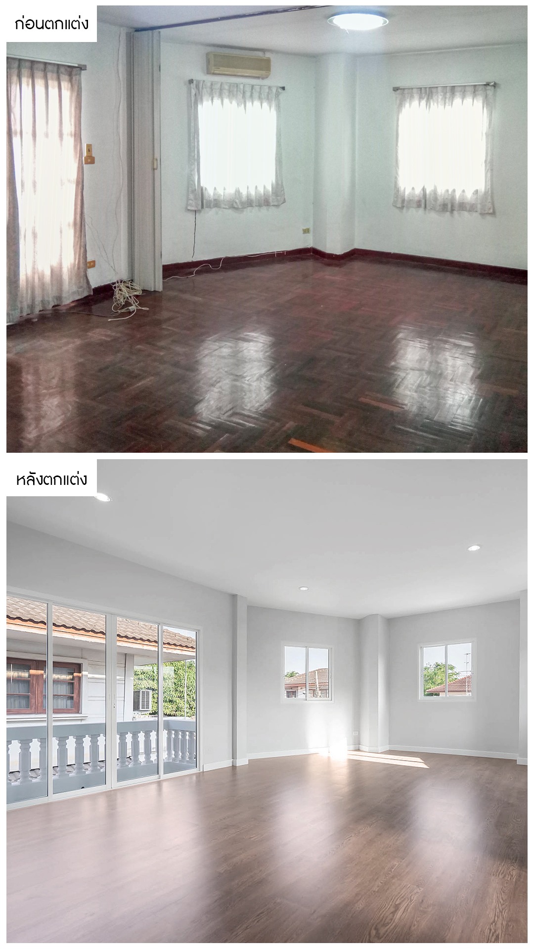 เราได้เปลี่ยนพื้นใหม่ให้เป็นลามิเนทที่มีความสวยงาม และคงทน พร้อมปรับโทนสีเป็นขาวสว่างทำให้น่าพักผ่อนมากขึ้น และประตู-หน้าต่างกระจกบานสไลด์ที่ช่วยให้ห้องโปร่งกว้างพร้อมรับแสงธรรมชาติได้อย่างเต็มที่ พร้อมติดไฟดาวน์ไลท์ เพื่อปรับโทนของห้องให้ดูอบอุ่น และมีมิติมากขึ้น