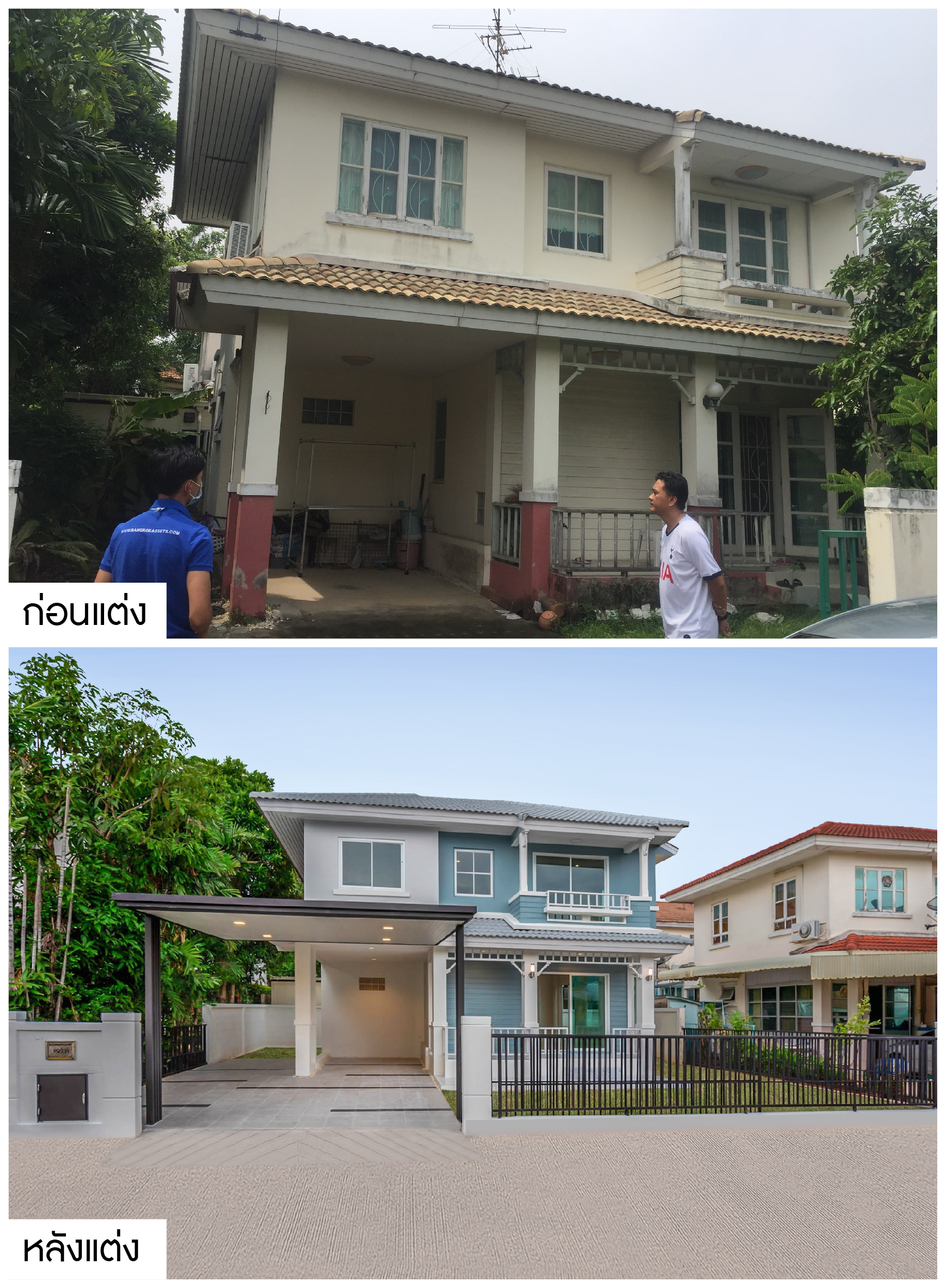 จากเดิมบ้านดูเก่า ไม่สวยงาม และสีซีดจางไปตามกาลเวลา เพื่อให้โดดเด่น เราได้ทาสีใหม่ทั้งหลังทำให้บ้านดูมีชีวิตชีวามากขึ้นครับ พร้อมเคลียร์พื้นที่หน้าบ้านที่ดูรกทึบให้โปร่งโล่ง ทำให้กลับมามีพื้นที่สนามหญ้าที่สวยงามพร้อมทุกกิจกรรมในครอบครัวครับ