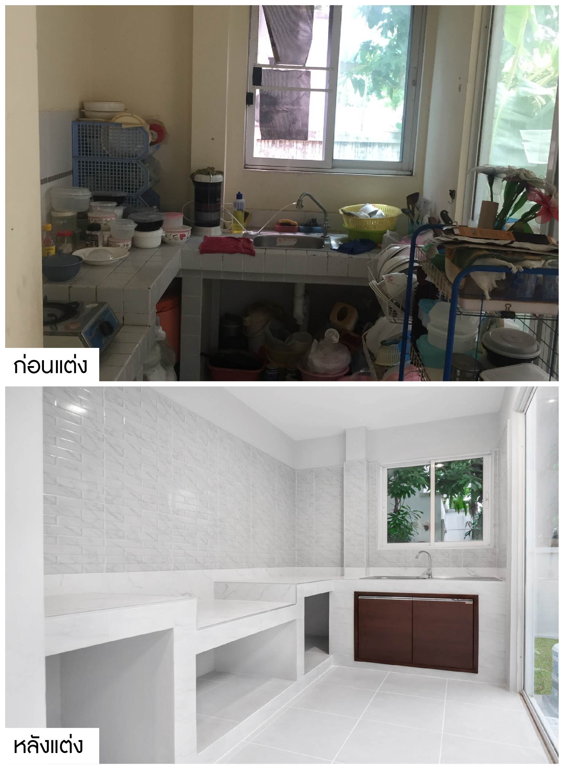 ห้องครัวที่เดิมไม่พร้อมใช้งาน เราได้ทำการปรับปรุงใหม่ด้วยการทาสีใหม่โดยเลือกใช้สีขาวสว่าง ต่อเติมครบครันทุกฟังก์ชั่น ทั้งครัวเคาน์เตอร์ ซิ้งล้างจาน แผงกันกระเด็น ปูพื้นด้วยกระเบื้องที่ง่ายต่อการทำความสะอาด และหน้าต่างกระจกที่สามารถรับแสงธรรมชาติได้อย่างเต็มที่