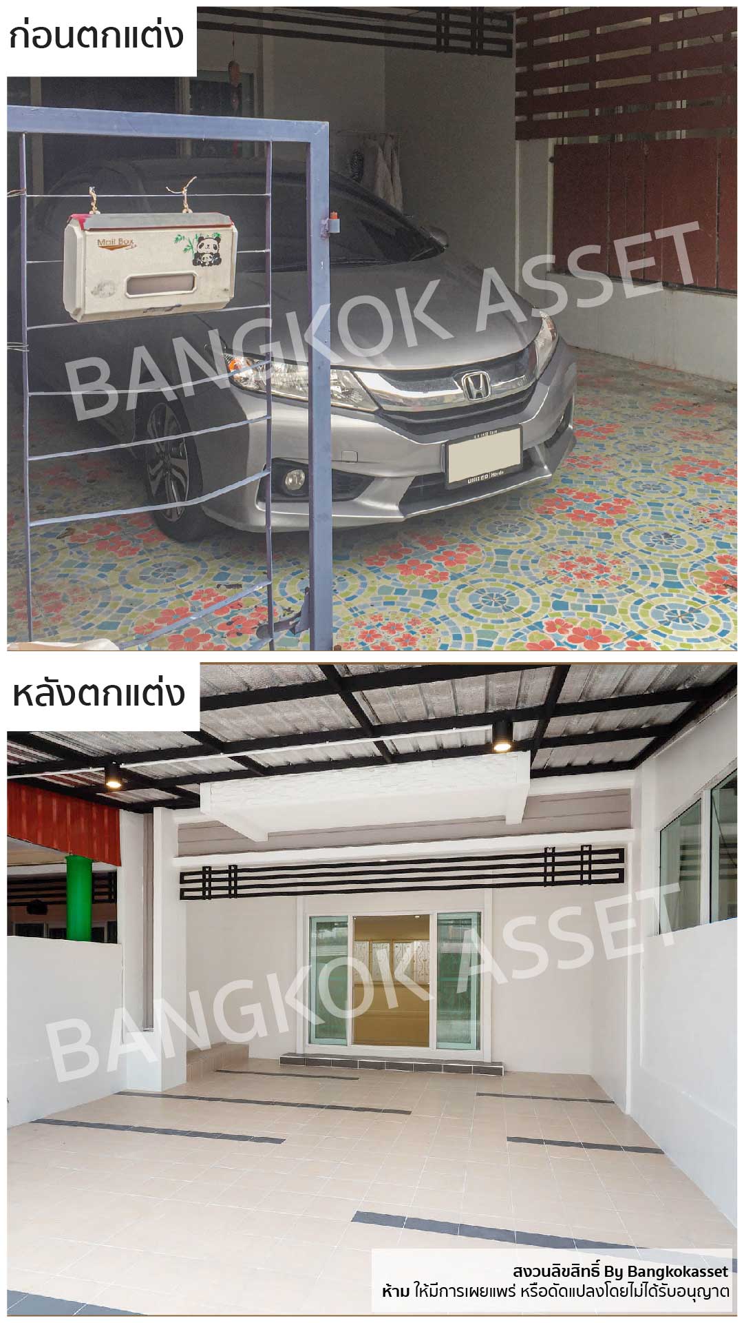 จากทาวน์เฮ้าส์หลังเก่า ได้แปลงสภาพตกแต่งใหม่ทั้งหลัง โดยการทาสีใหม่ให้ดูขาวสว่างยิ่งขึ้น พื้นที่ลานจอดรถเราได้ปูกระเบื้องกันลื่นให้ใหม่