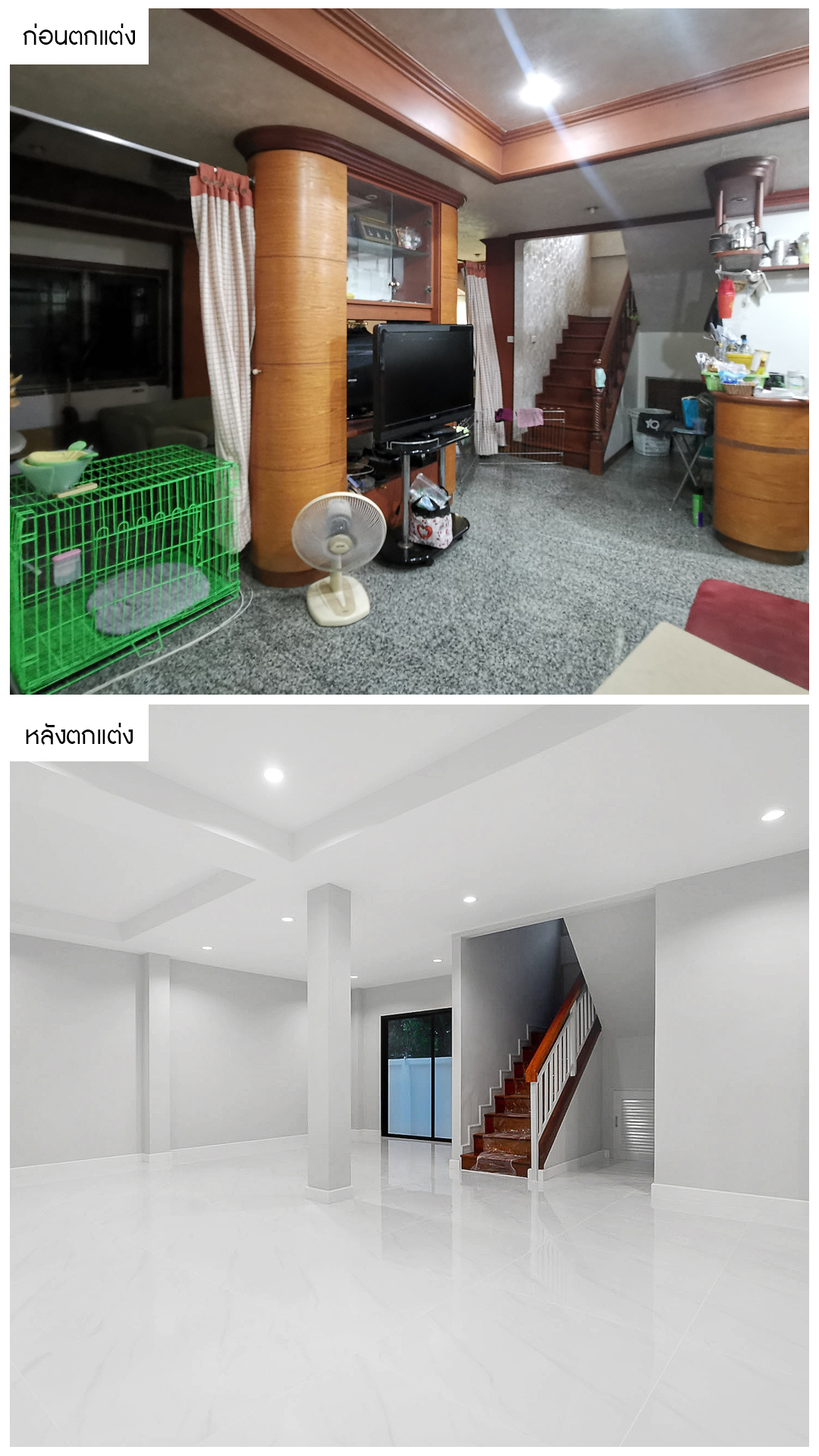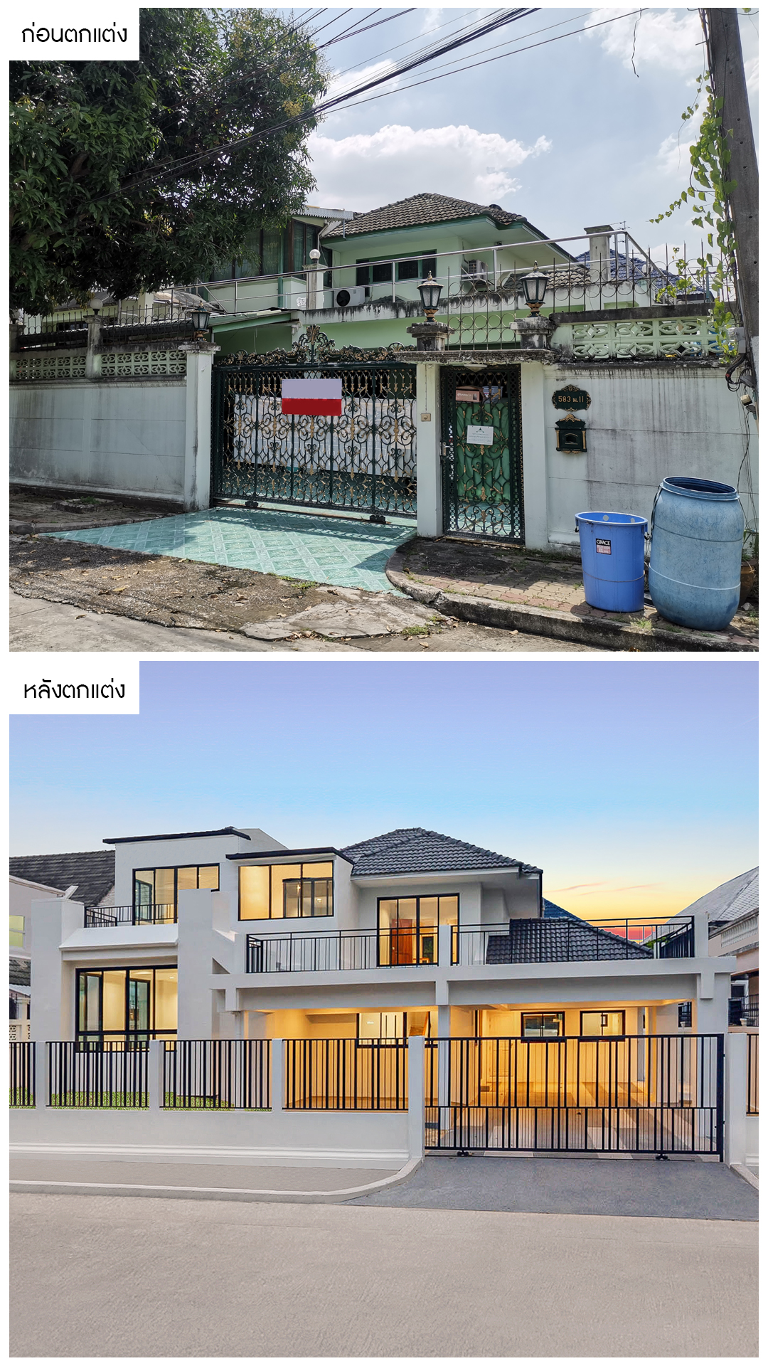 จากบ้านหลังเดิมเก่า ดูไม่สวยงาม ไม่น่าอยู่อาศัย เราได้ปรับปรุงใหม่ทั้งหมด โดยการรื้อพื้นที่ เคลียร์บริเวณบ้านใหม่ทั้งหมดให้บ้านกลับมามีพื้นที่ทำกิจกรรม พร้อมเปลี่ยนรั้วใหม่ทั้งหมดให้เป็นรูปแบบโมเดิร์นดูโปร่งโล่ง เพิ่มความโดดเด่นให้กับตัวบ้าน และตกแต่งทาสีบ้านใหม่ทั้งหลัง เป็นโทนสีขาวเพิ่มความทันสมัย ดูสวยงามสบายตา พร้อมตกแต่งด้วยวัสดุคุณภาพพรีเมี่ยมทำให้บ้านสวยงามทั้งภายในและภายนอก กลับมาเป็นบ้านที่มีชีวิตชีวาอีกครั้งครับ