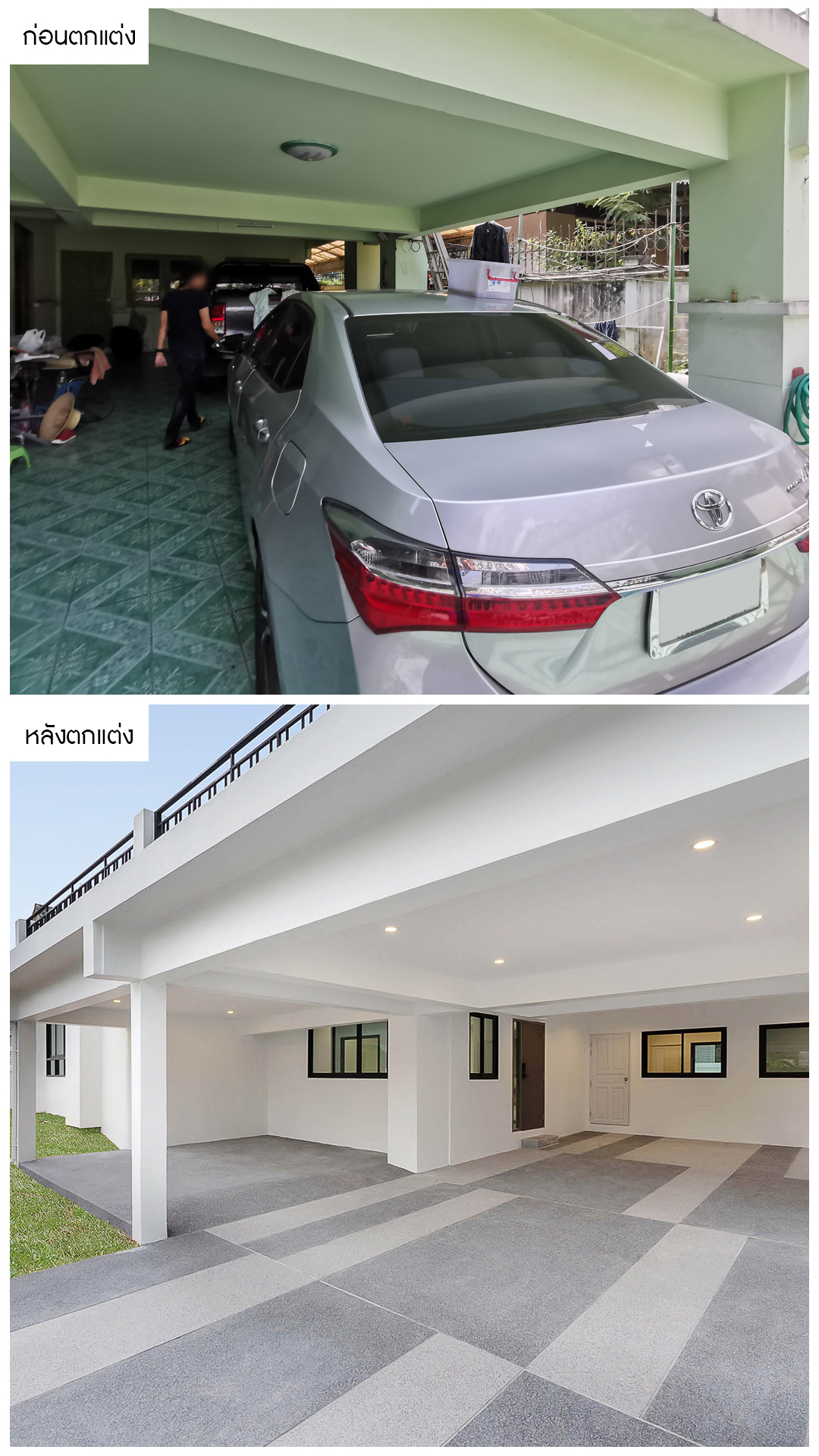 เราได้ทำการเคลียร์พื้นที่โดยรอบบ้าน ปรับปรุงพื้นที่สนามหญ้าให้โปร่งโล่งสามารถกลับมาทำกิจกรรมOutdoorได้อีกครั้ง  ในส่วนของโรงรถเราได้ปูพื้นทรายล้างที่มีความสวยงามปลอดภัยและหรูหราที่นิยมในบ้านหรู เน้นให้ดูโปร่ง กว้าง ออกแบบมาเพื่อให้มีแสงธรรมชาติ และลมพัดเข้าทางหน้าบ้านครับ