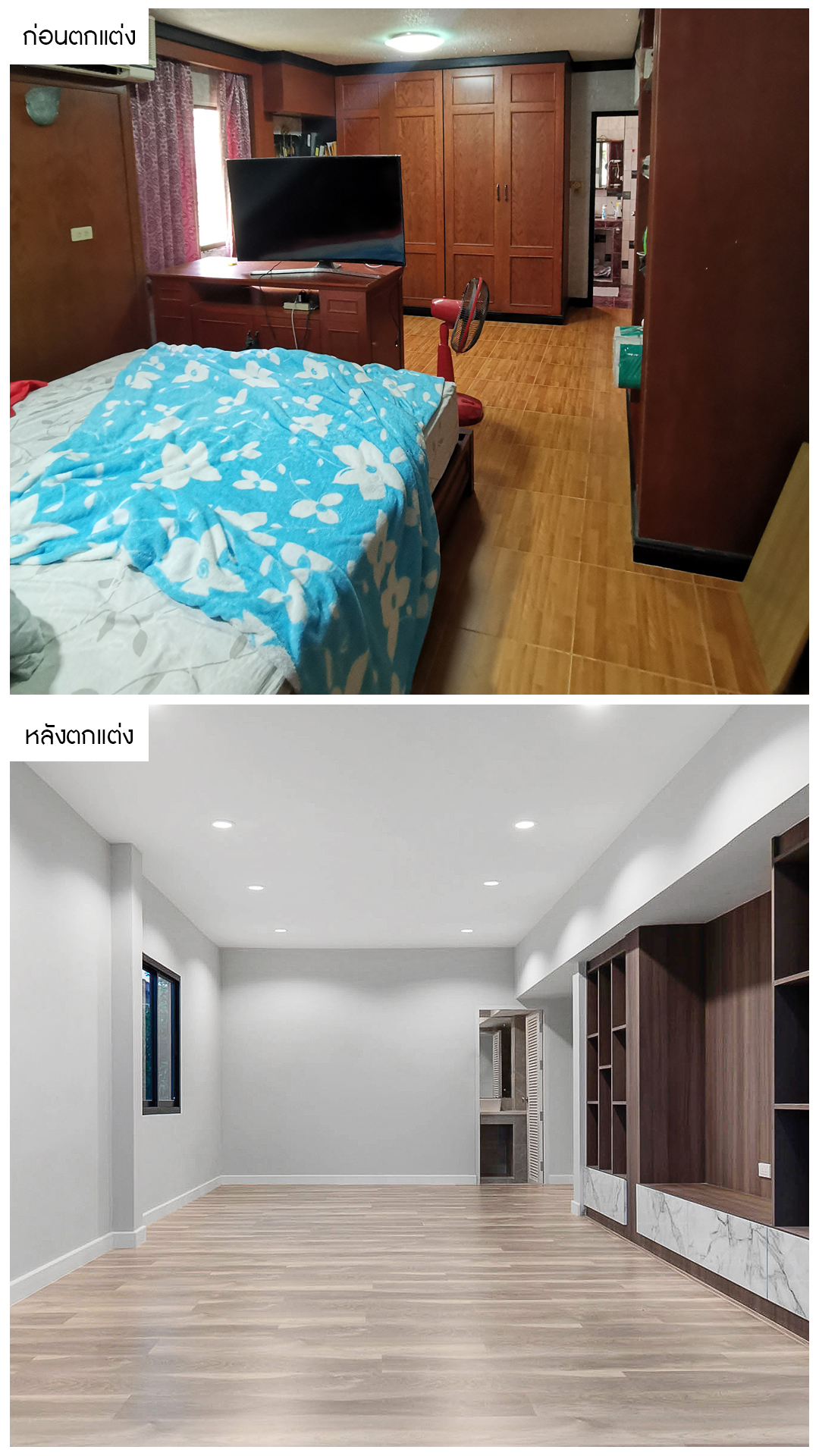 ห้องนอนจากเดิมที่มีสภาพเก่า ดูไม่ทันสมัยไม่เหมาะแก่การพักผ่อน เราได้เปลี่ยนให้ใหม่ด้วยพื้นลามิเนตที่ทั้งสวยงาม คงทนและนิยมใช้ในบ้านยุคใหม่ นอกจากนั้นยังเปลี่ยนโทนสีภายในห้องเป็นโทนขาวดูสว่างสะอาดตามากยิ่งขึ้น พร้อมประตู-หน้าต่างกระจกบานใหญ่รอบด้าน เชื่อมต่อระเบียง ให้ความรู้สึกผ่อนคลาย สามารถรับแสงธรรมชาติได้อย่างเต็มที่ พร้อมจัดเต็ม! Built in Furniture แบบสวยงามพร้อมทุกการอยู่อาศัยเลยครับ