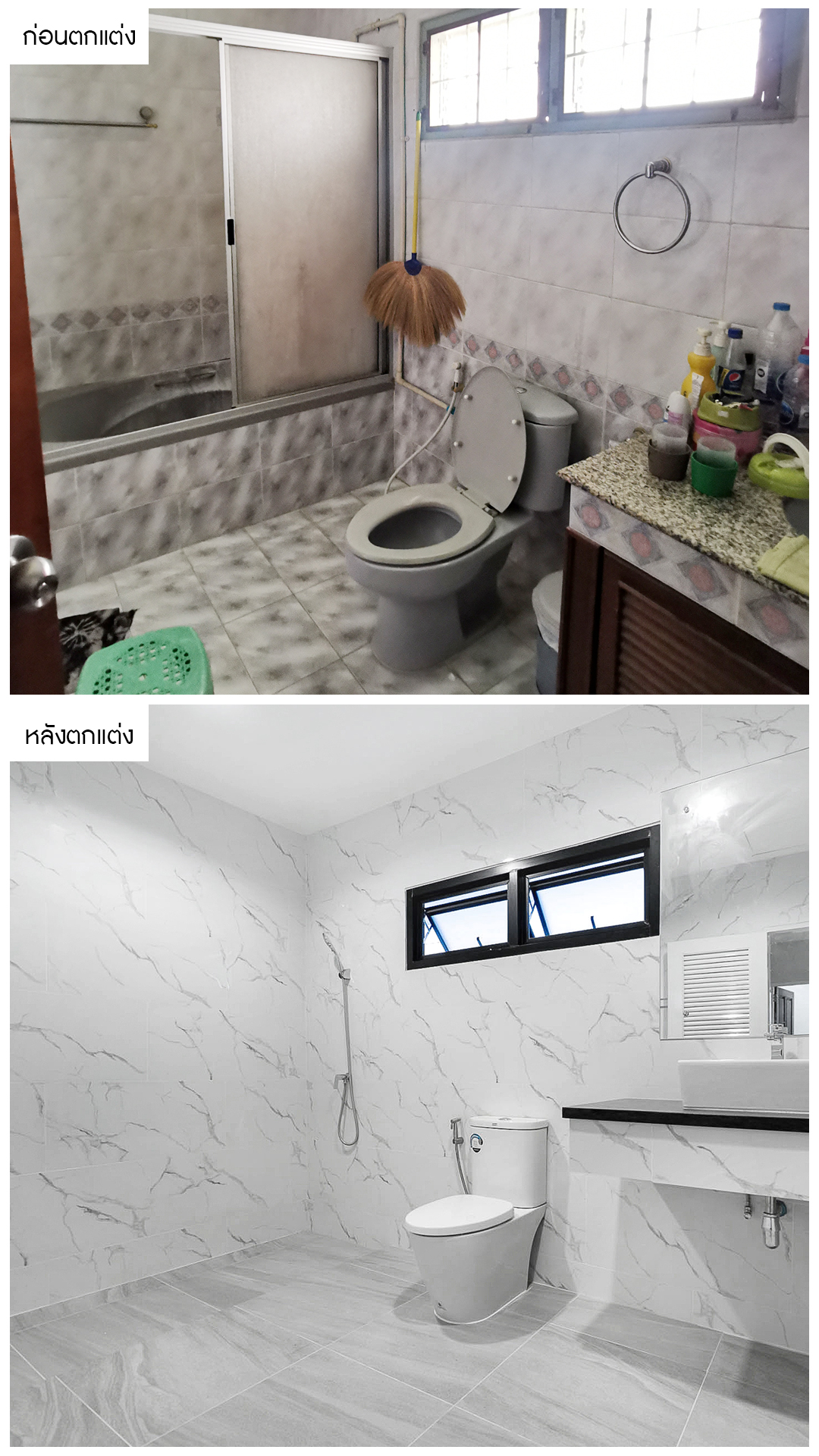 ห้องน้ำแบบเก่าที่ดูไม่สวยงาม และไม่พร้อมใช้งาน เราได้ทำการรีโนเวทใหม่ โดยกำหนดธีมหลักเป็นโทนสีขาวที่ทำให้ดูโมเดิร์น สะอาดตาน่าใช้งาน พร้อมตกแต่งหรูหราด้วยลายหินอ่อน ครบครันทุกฟังก์ชั่นโดยปูพื้นกระเบื้องกันลื่น เพื่อความปลอดภัยและง่ายต่อการทำความสะอาด พร้อมคัดสรรสุขภัณฑ์ที่ได้มาตรฐาน สวยงาม และคงทน พร้อมทุกการเข้าอยู่เลยครับ