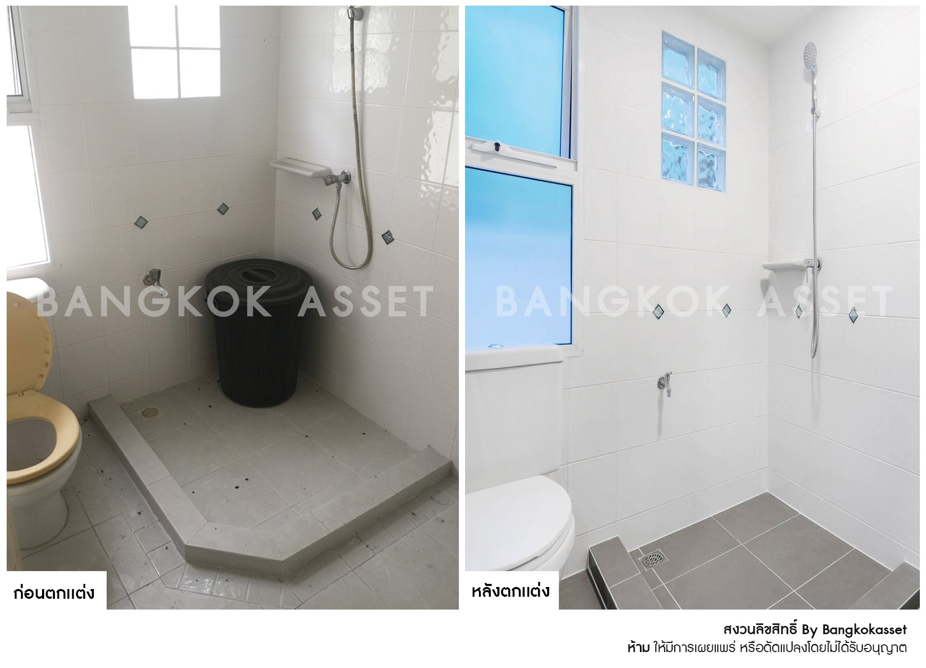 ตกแต่งสไตล์โมเดิร์น คัดสรรวัสดุคุณภาพพรีเมี่ยม เปลี่ยนสุขภัณฑ์ให้ใหม่ทั้งหมด เปลี่ยนกระเบื้องผนังใหม่ และกระเบื้องพื้นแบบกันลื่นเพื่อความปลอดภัย