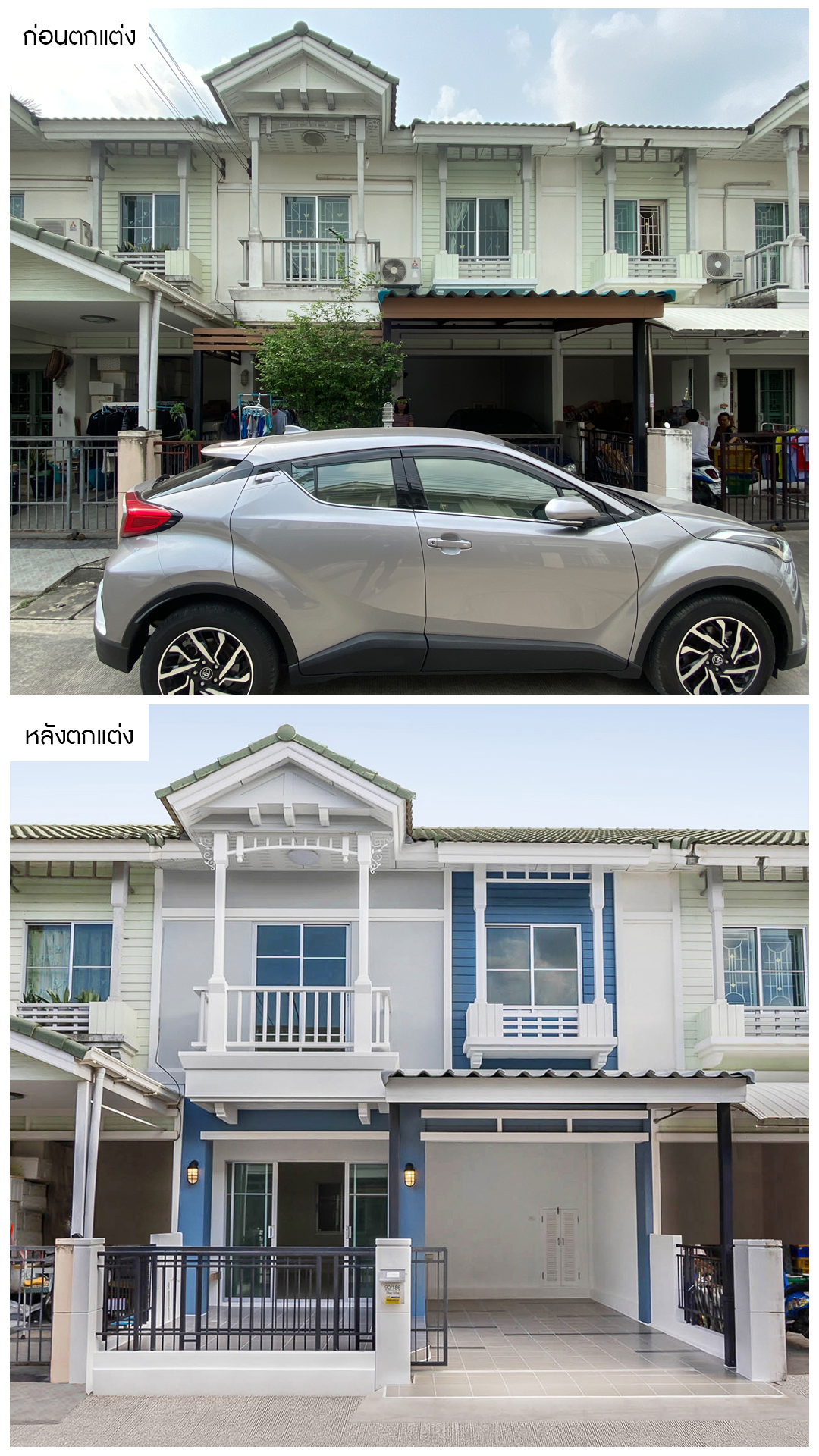 ภายนอกบ้านที่ดูเก่า ไม่น่ามอง สีซีดจาง เราได้ทำการรีโนเวทโดยทาสีใหม่ทั้งหลัง โดยเลือกโทนสีขาวตัดฟ้าครามที่มีความโดดเด่น และให้ความรู้สึกโมเดิร์นมากขึ้น