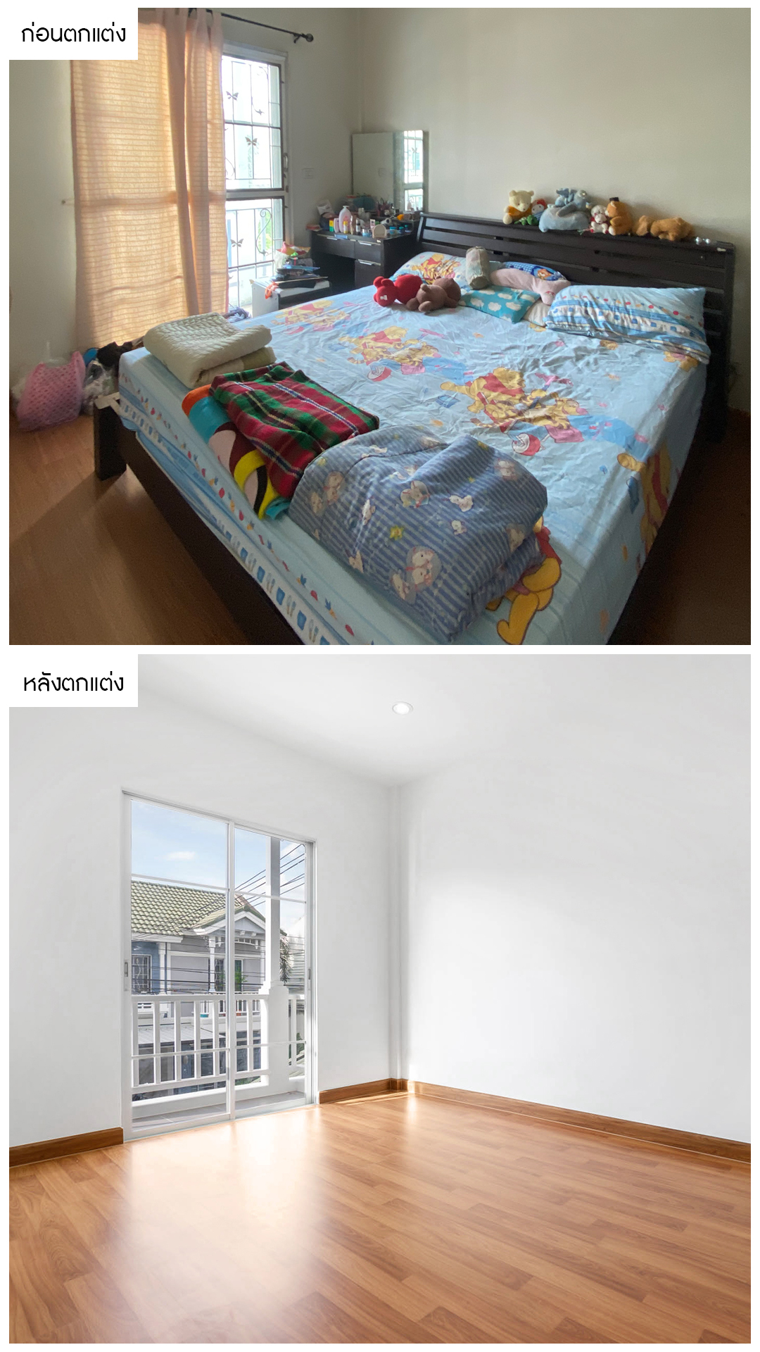 ห้องนอนที่ดูไม่น่าพักผ่อน เราได้เปลี่ยนให้สวยงามด้วยพื้นลามิเนต ที่ดูทันสมัยและคงทน พร้อมเปลี่ยนโทนสีภายในห้องให้ดูขาวสว่างมากยิ่งขึ้น เพิ่มบรรยากาศผ่อนคลายน่าพักผ่อน พร้อมปรับปรุงหน้าต่าง-ประตูเชื่อมระเบียงเป็นแบบกระจกบานเลื่อนเพื่อเปิดรับแสงธรรมชาติได้อย่างเต็มที่ และติดตั้งไฟแบบดาวน์ไลท์ ที่ทั้งสวยงาม และประหยัดไฟครับ