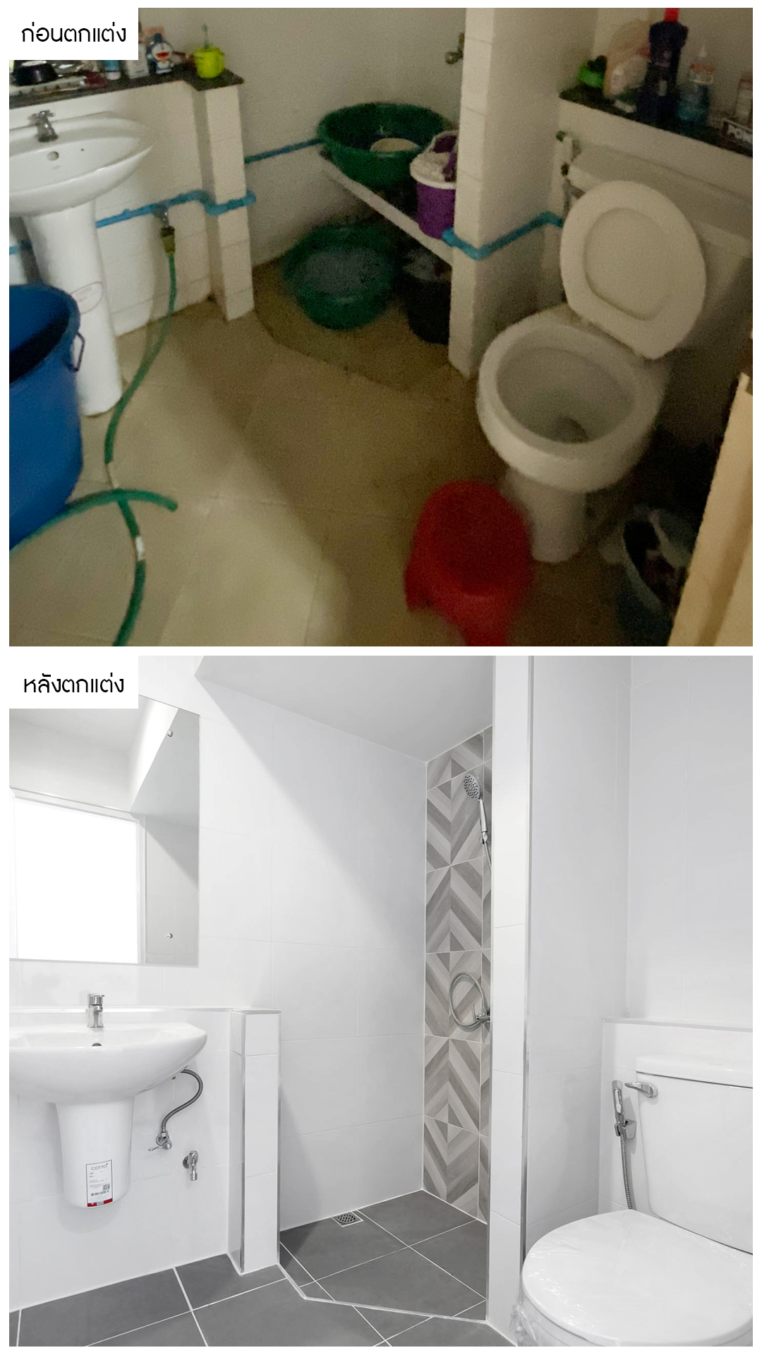จากเดิมที่ห้องน้ำมีสภาพเก่า ไม่เหมาะแก่การใช้งาน เราได้ทำการตกแต่งใหม่ให้เป็นดีไซน์โมเดิร์น และปูพื้นกระเบื้องกันลื่นจรดเพดาน เพื่อความปลอดภัยและง่ายต่อการทำความสะอาด คัดสรรวัสดุคุณภาพดี ทั้งอ่างล้างหน้า กระจก ฝักบัว และสุขภัณฑ์ ครบครันทุกการใช้งานเลยทีเดียวครับ