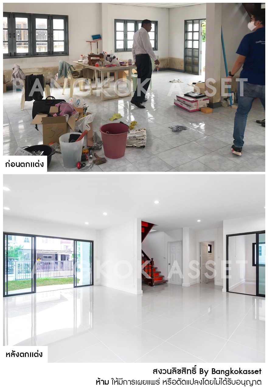 ภายในดูกว้างขึ้นด้วยการทาสีโทนขาวสว่าง พร้อมปูพื้นแกรนิโต้ลายหินอ่อนแผ่นใหญ่เพิ่มความหรูหรา น่าอยู่อาศัย พร้อมติดตั้งไฟดาวน์ไลท์ที่ทำให้บ้านดูมีมิติมากขึ้น และเปลี่ยนประตูหน้าต่างให้ใหม่ทั้งหมด