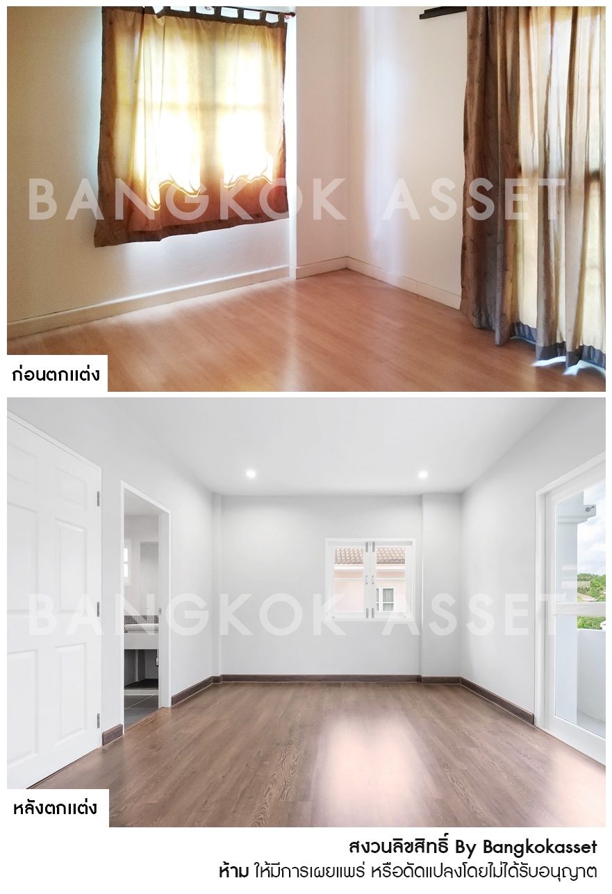 ห้องนอนทุกห้องเราเปลี่ยนเป็นพื้นไม้ลามิเนตลายเนื้อไม้จริง เพื่อให้ห้องดูอบอุ่น สบาย และยังคุมโทนสีภายในห้องเป็นโทนขาวสว่าง เพิ่มความรู้สึกผ่อนคลายให้กับผู้อยู่อาศัยอีกด้วย