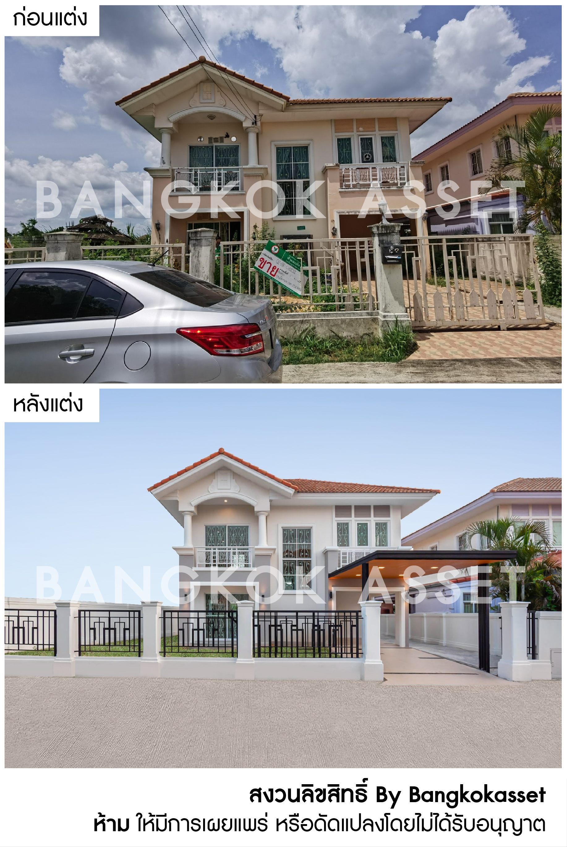 จากบ้านที่เหมือนจะเป็นบ้านร้างไปเสียแล้ว เราได้แปลงสภาพตกแต่งใหม่ทั้งหลัง ด้วยการทาสีใหม่ขาว เทา ทำให้ดูขาวสว่างยิ่งขึ้น เพิ่มความโดดเด่นให้บ้านทั้งหลัง เคลียร์ต้นไม้ทั้งหมด และเพิ่มหลังคาลานจอดรถแบบเมทัลชีทที่มีฉนวนกันความร้อนให้ด้วย